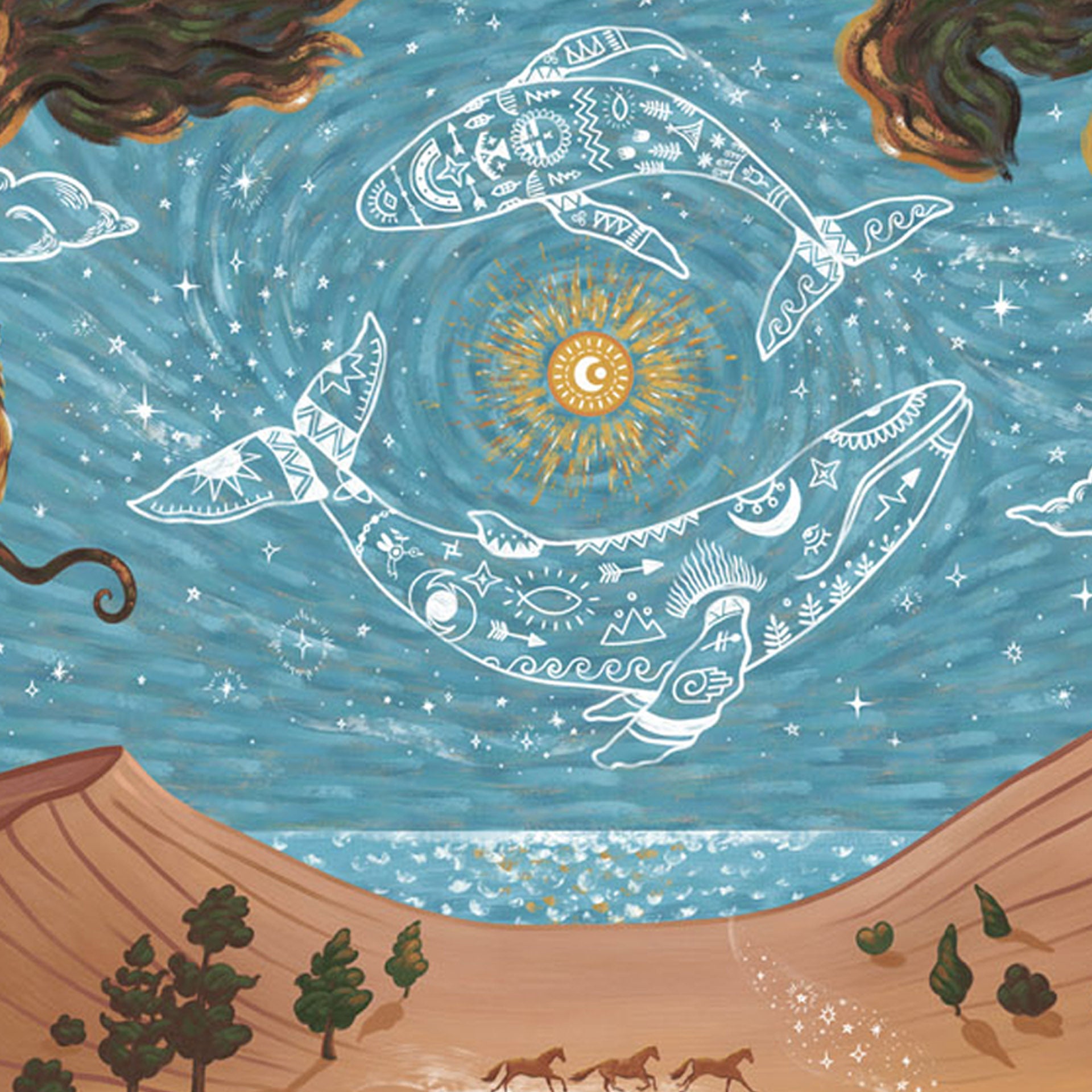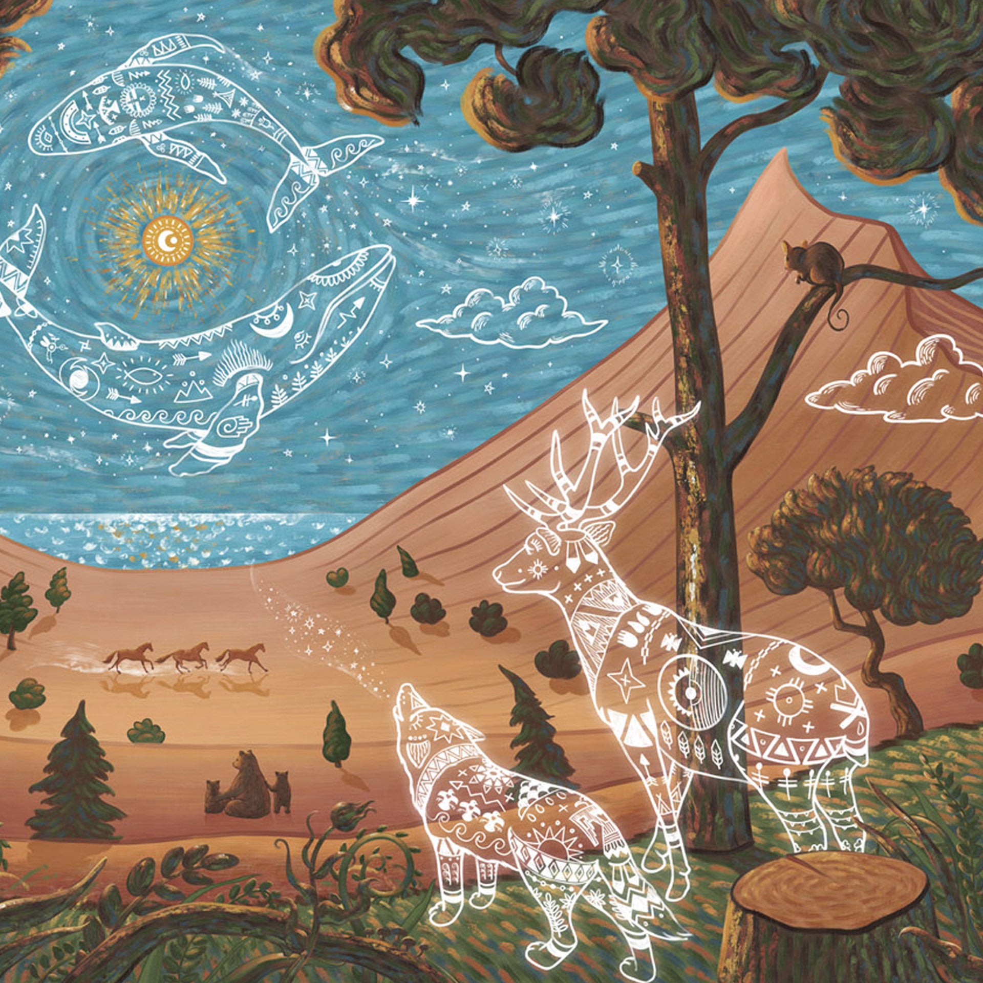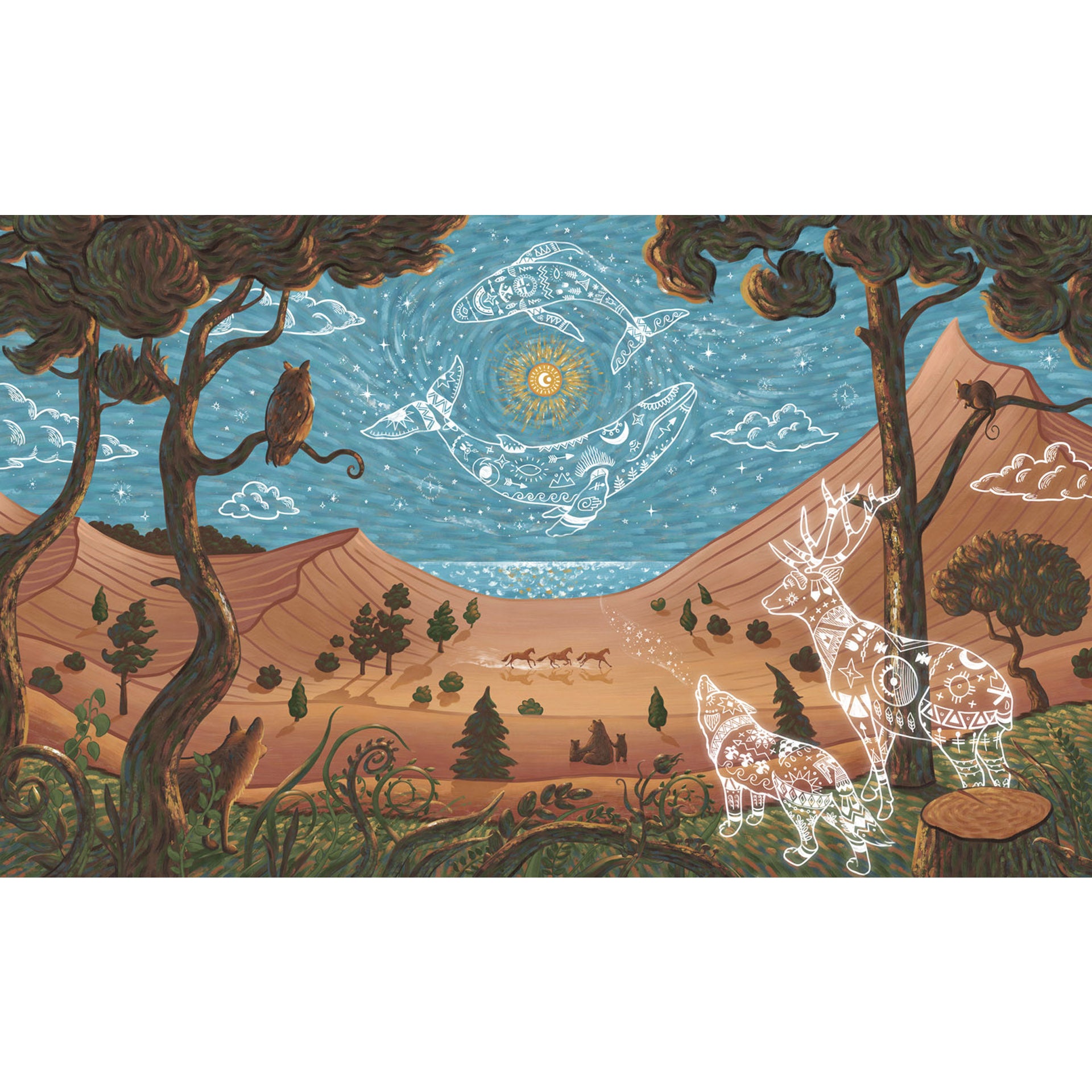 Dreamlike desert landscape showing patterned spirit deer and wolf watching ethereal whales circling a bright moon and stars, blending nature, folklore, and cosmic magic in a painted illustration.