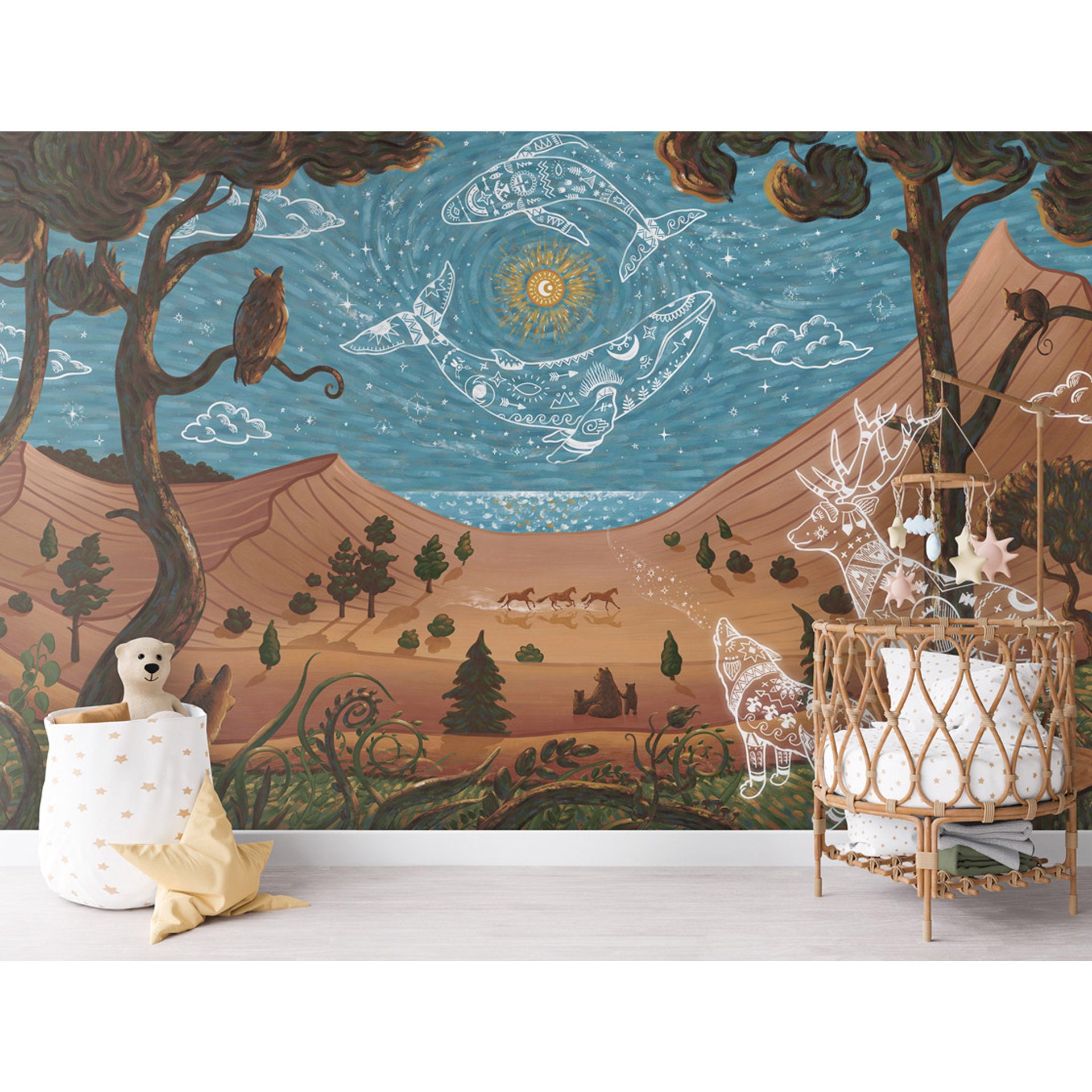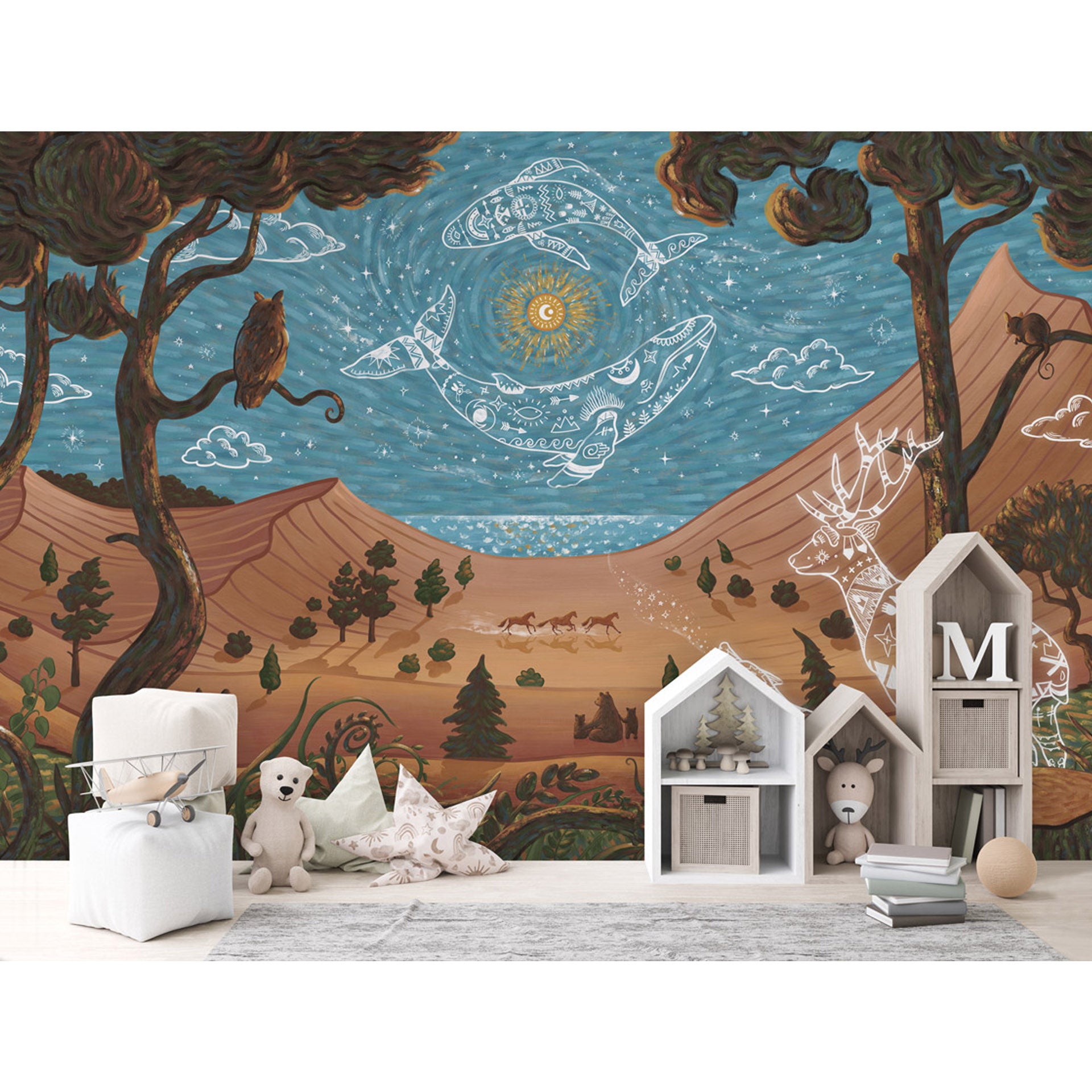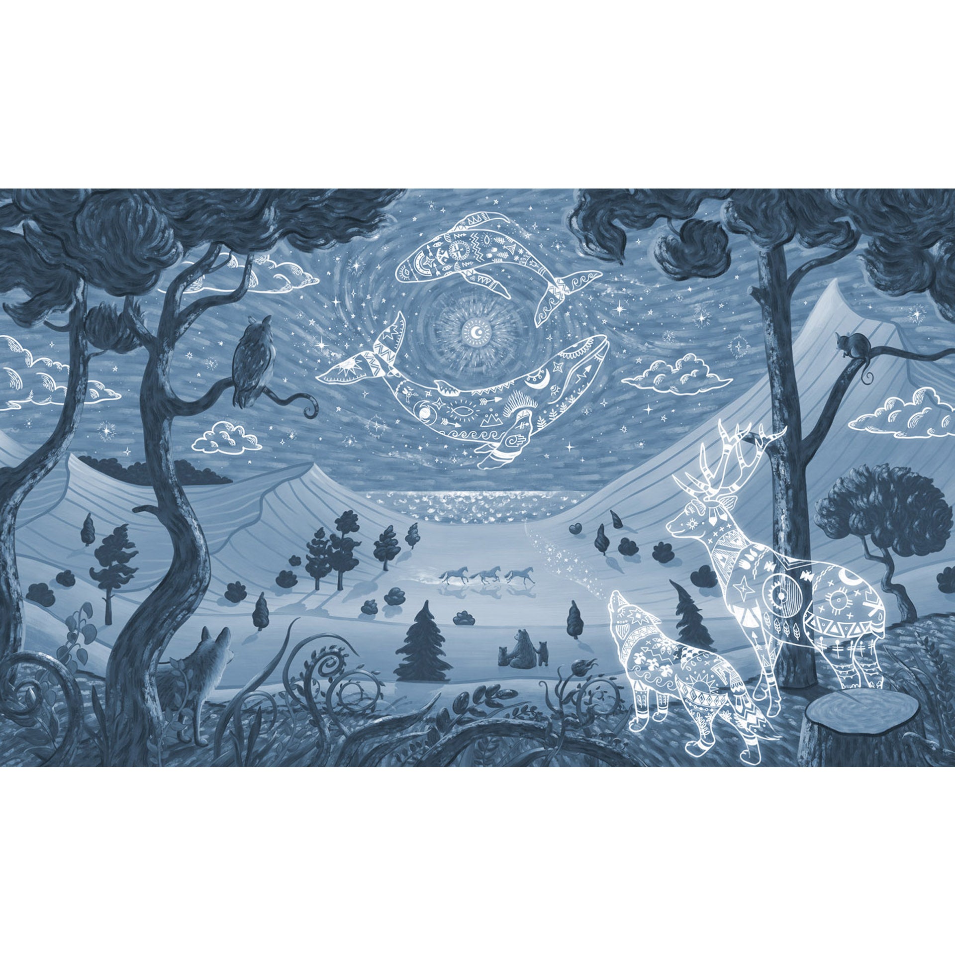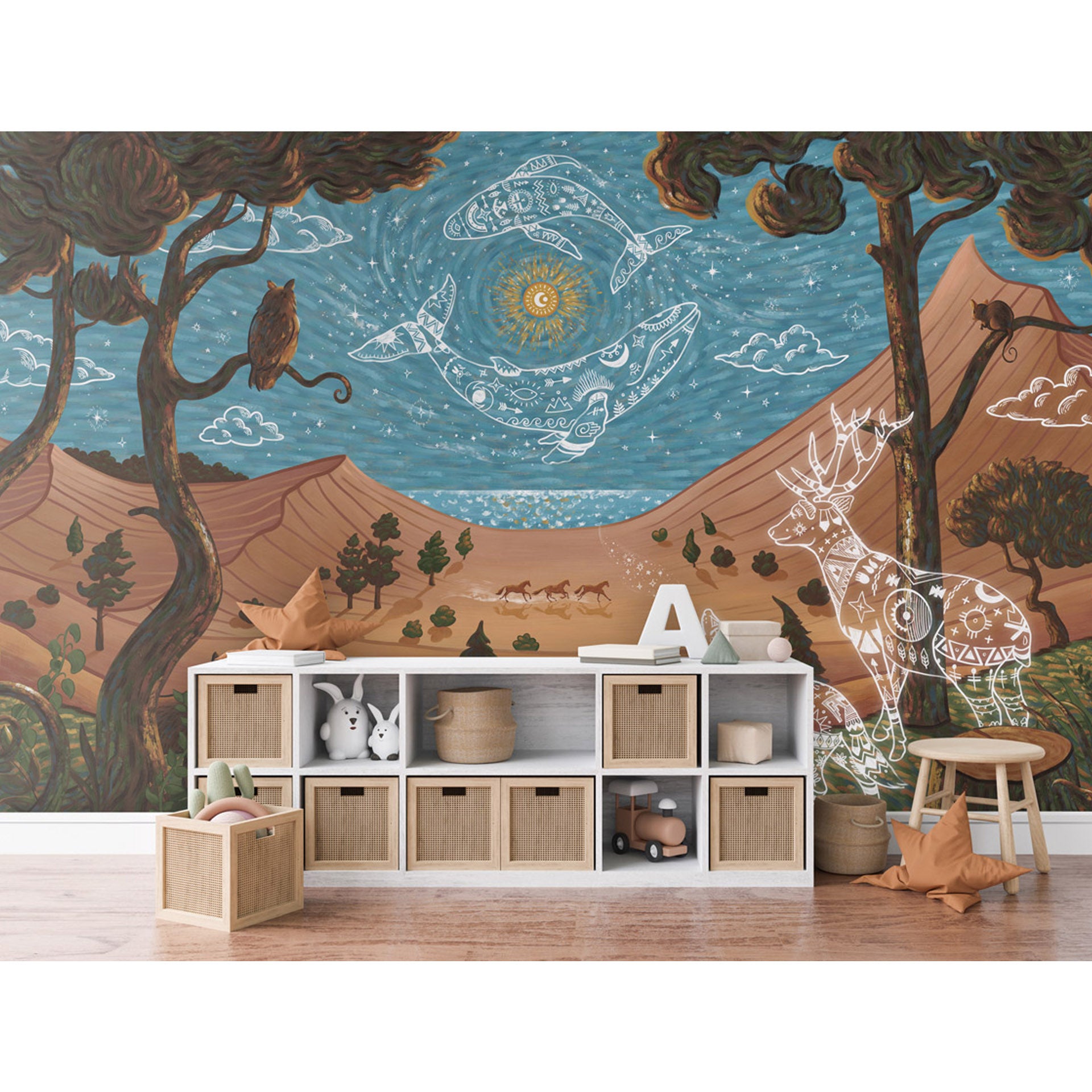Dreamlike desert landscape showing patterned spirit deer and wolf watching ethereal whales circling a bright moon and stars, blending nature, folklore, and cosmic magic in a painted illustration.