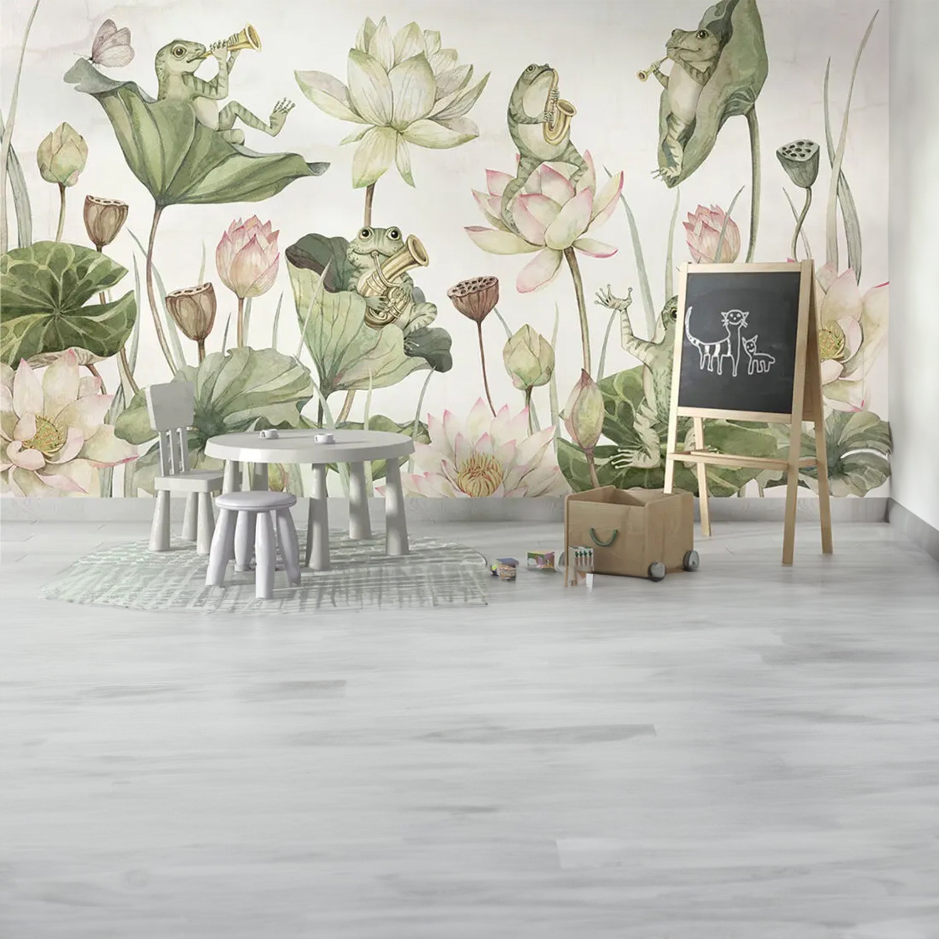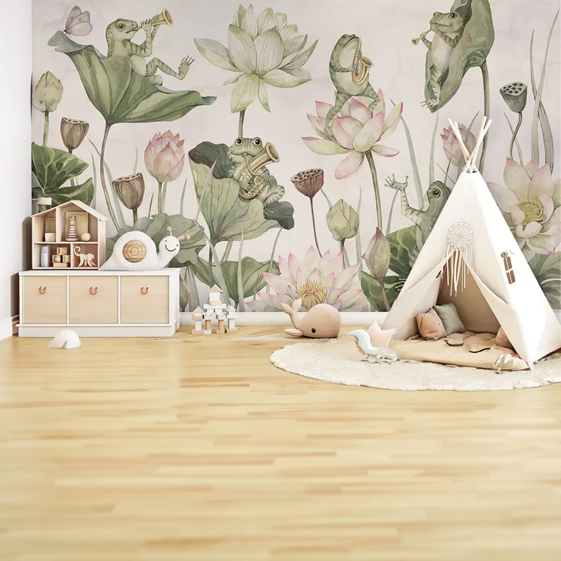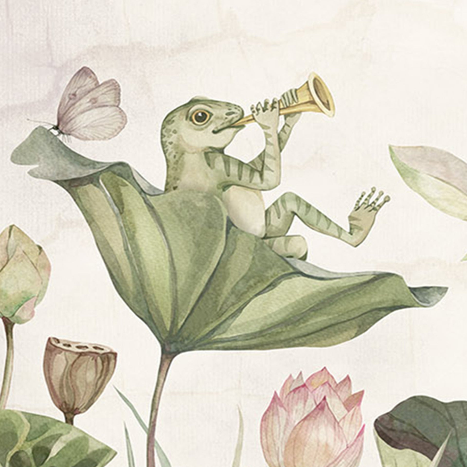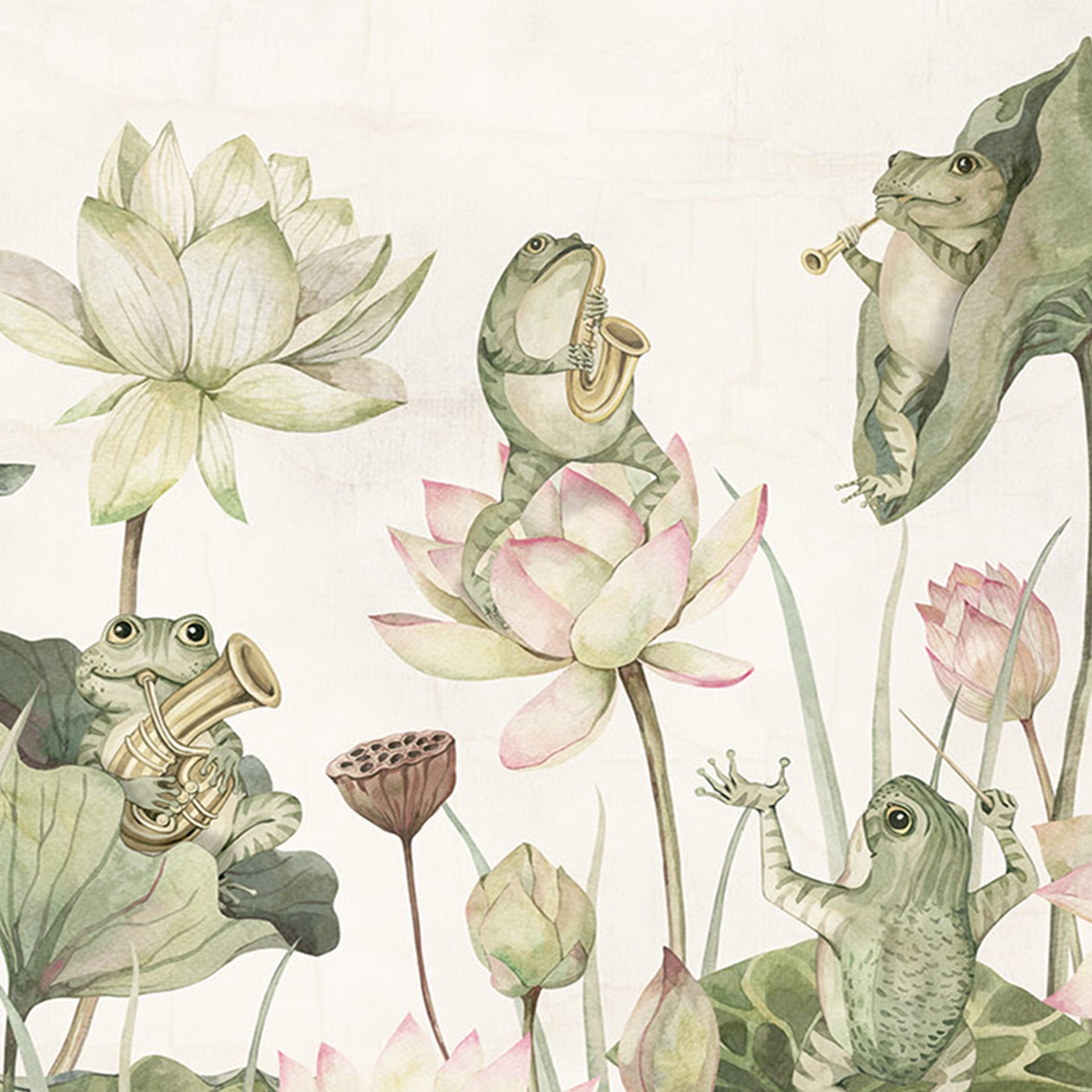 A charming watercolor scene featuring frogs playing trumpets and saxophones among pastel lotus flowers and lily pads, capturing playful nature, music, and fantasy in a serene pond setting.
