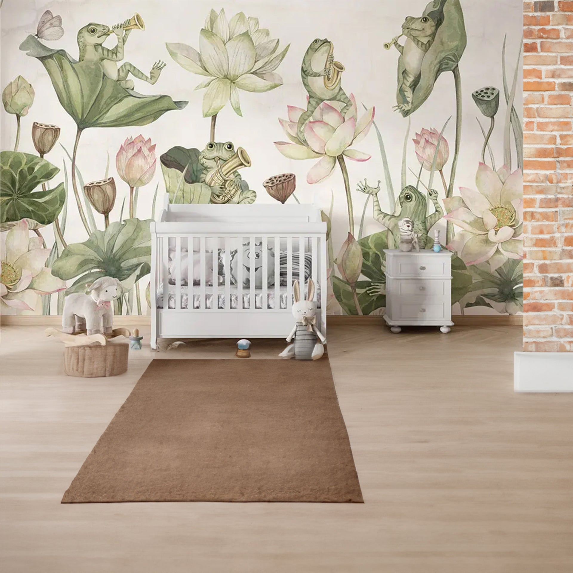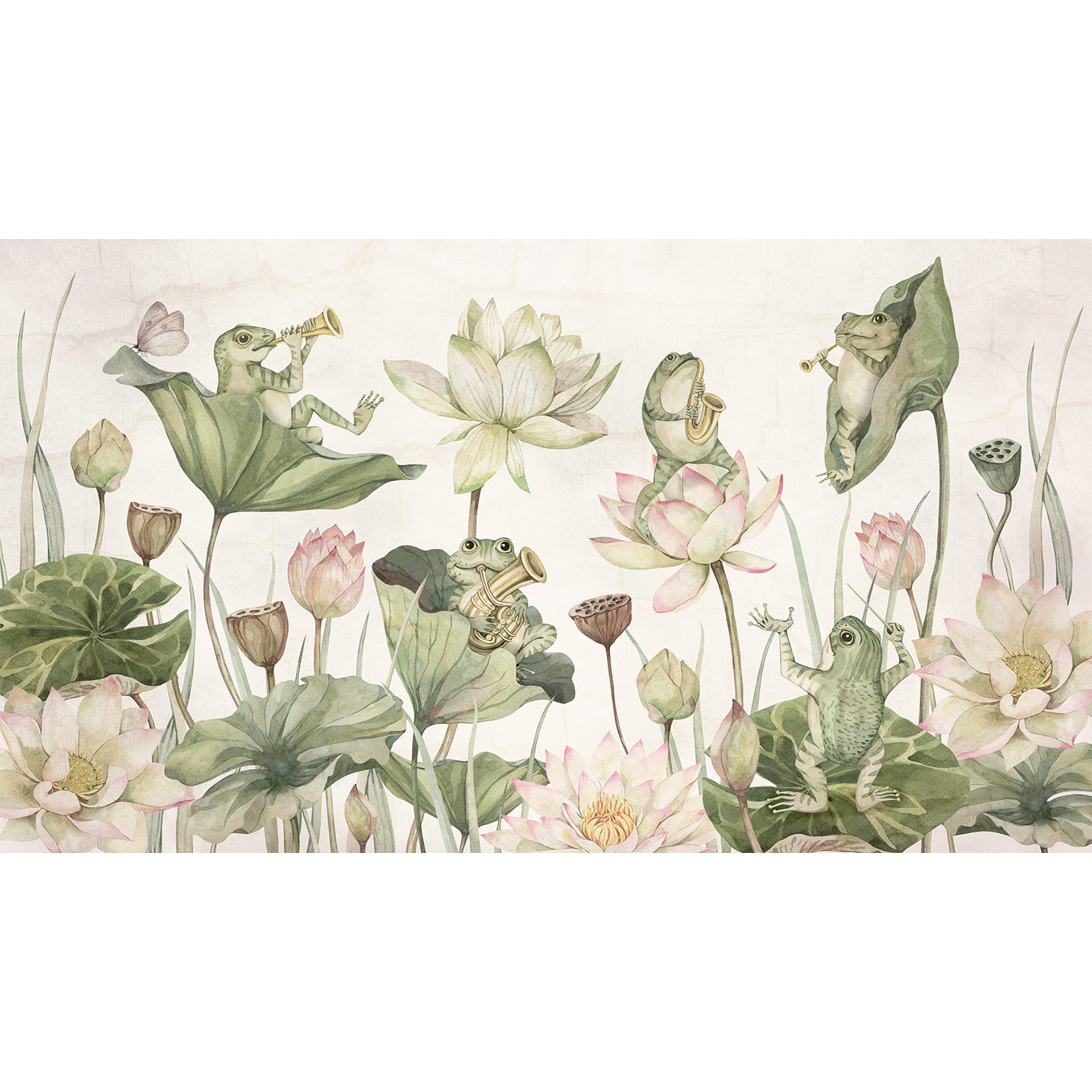 Water-Lily-Orchestra: Whimsical Frog Orchestra Amid Water Lilies And Lotus Flowers In Soft Watercolor