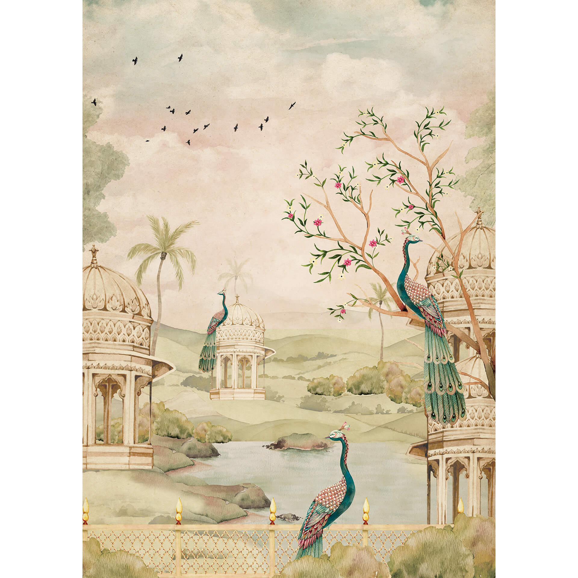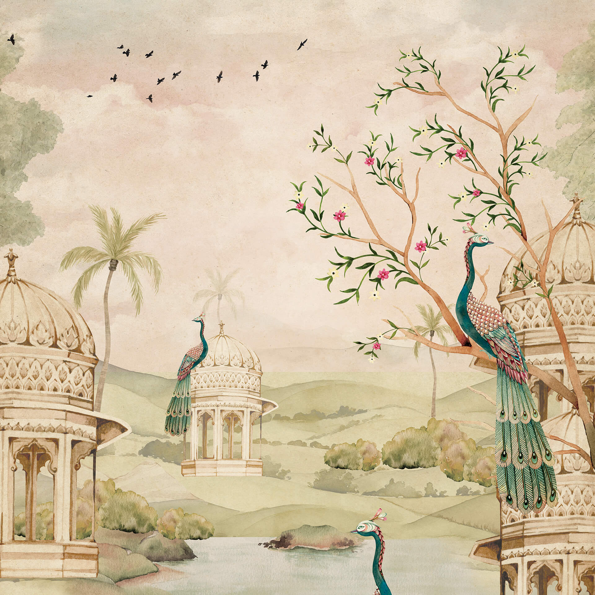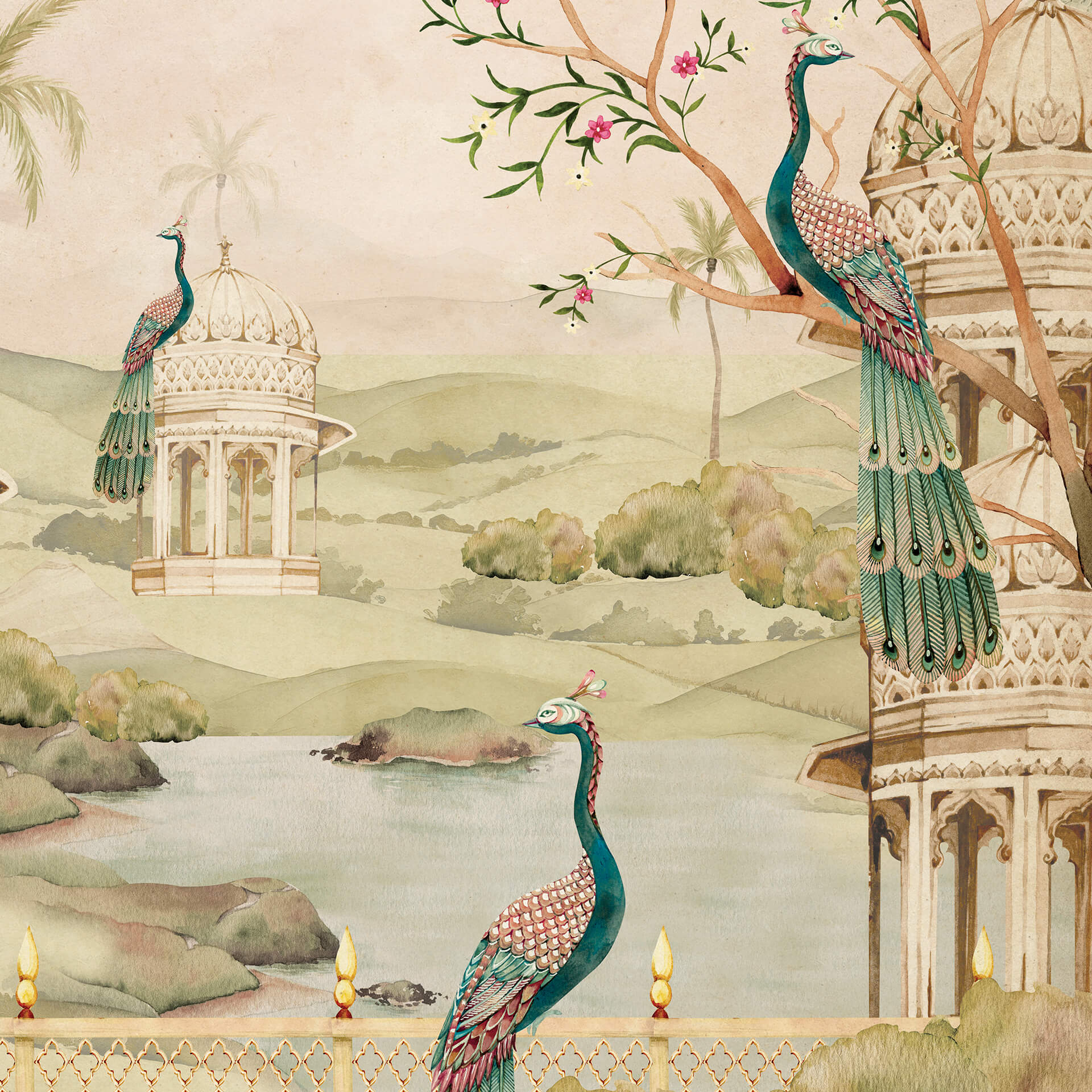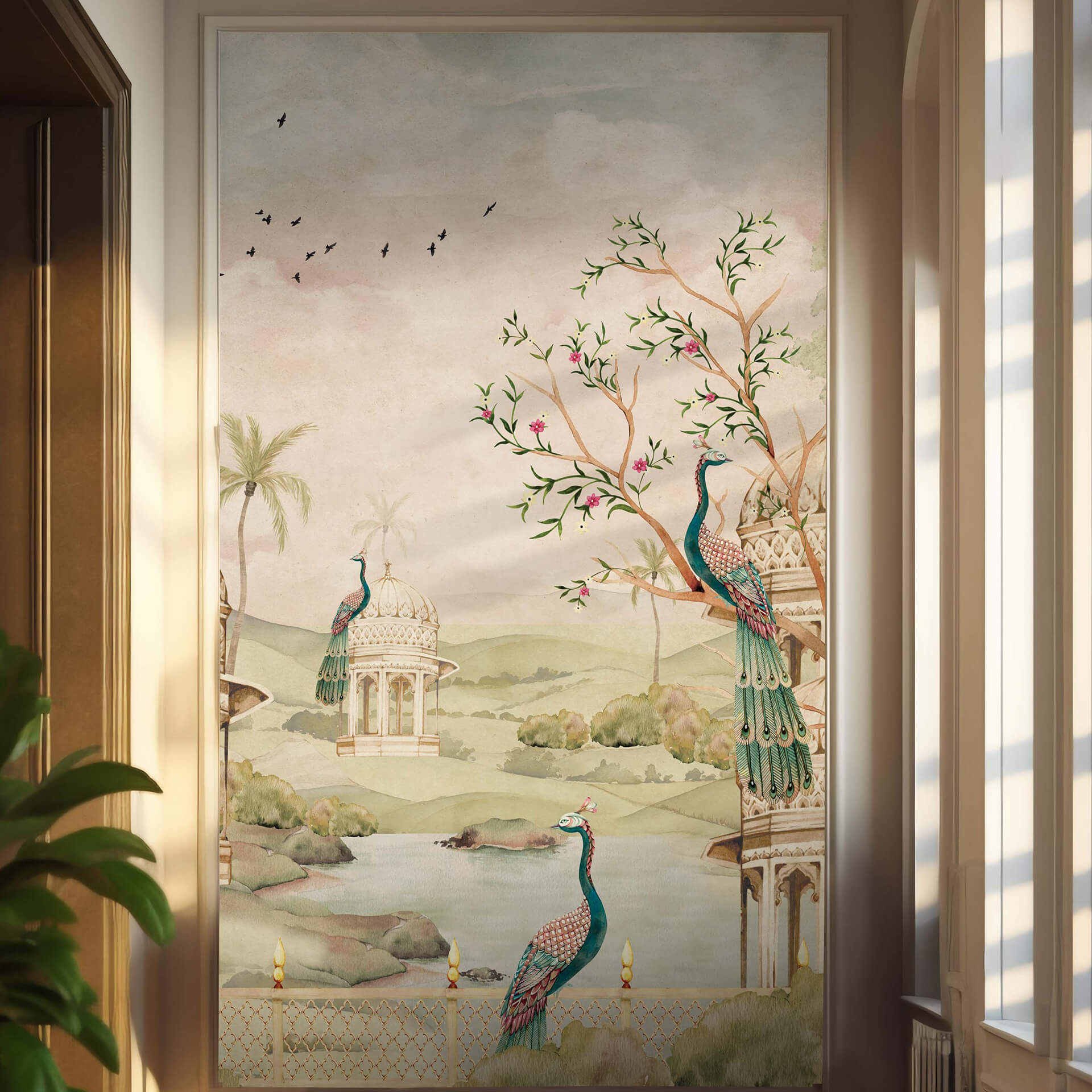 Indian Palace Wallpaper With Peacock Motifs in vibrant colors. This Indian Mahal wallpaper transforms any room into a sophisticated, artistic sanctuary. Perfect for living rooms, bedrooms, traditional or cultural spaces.
