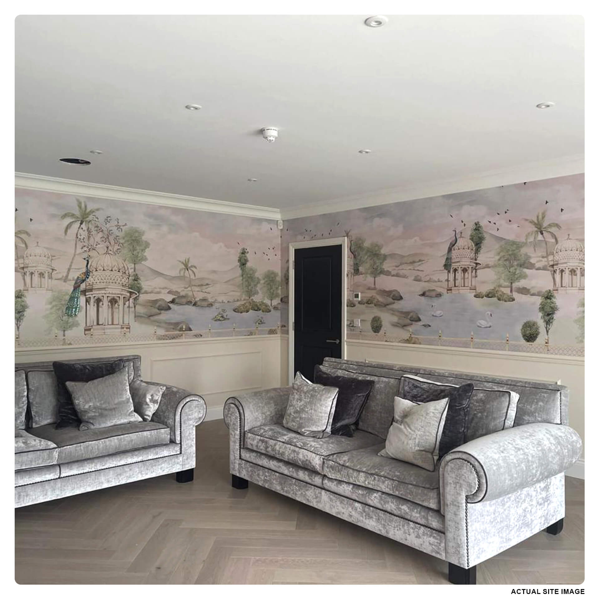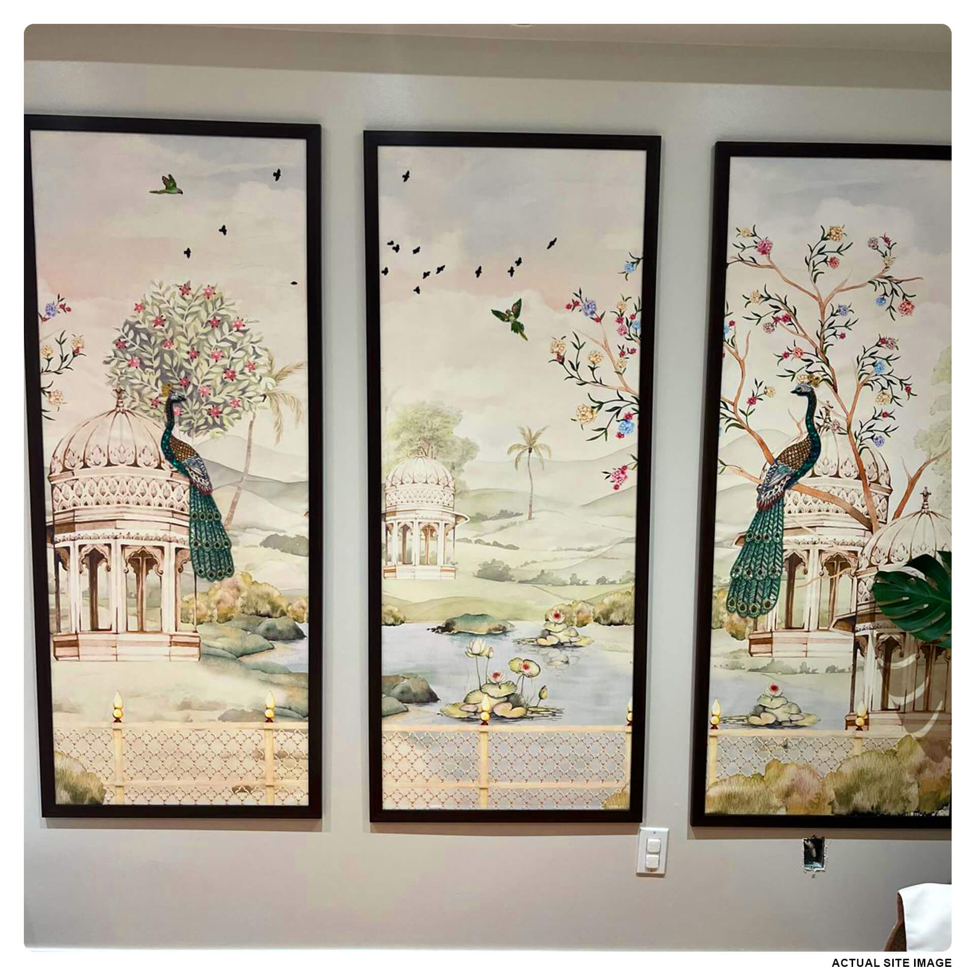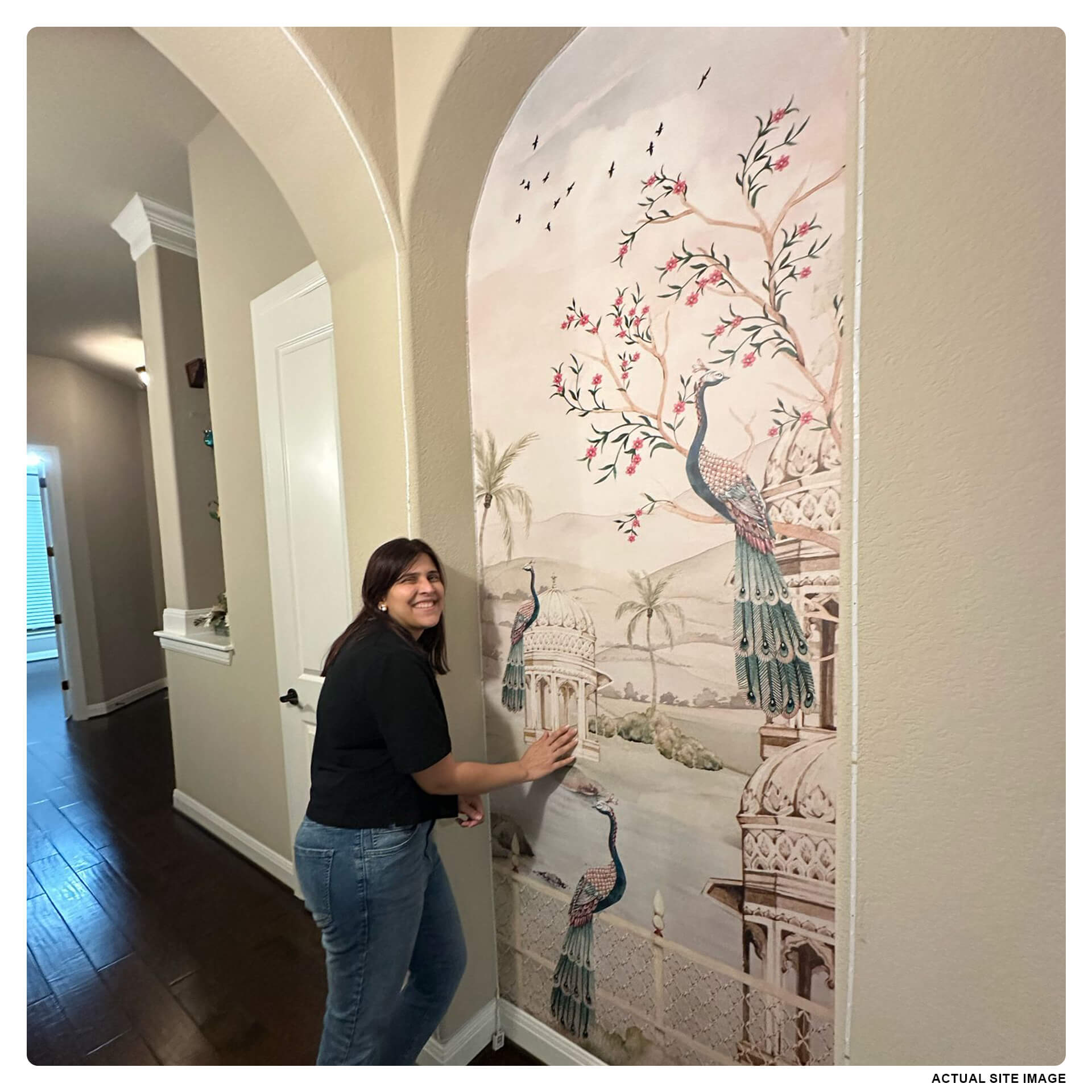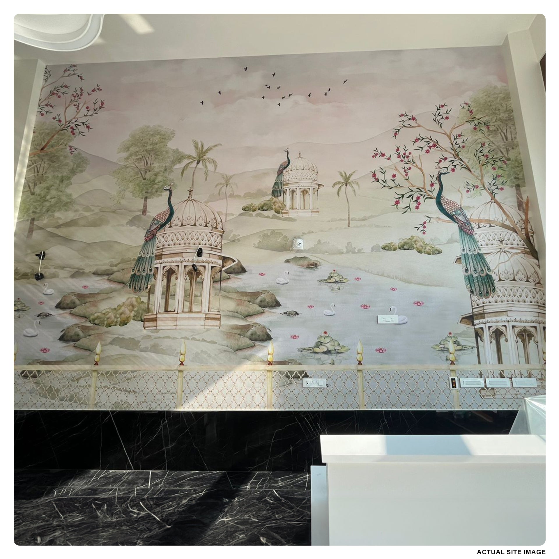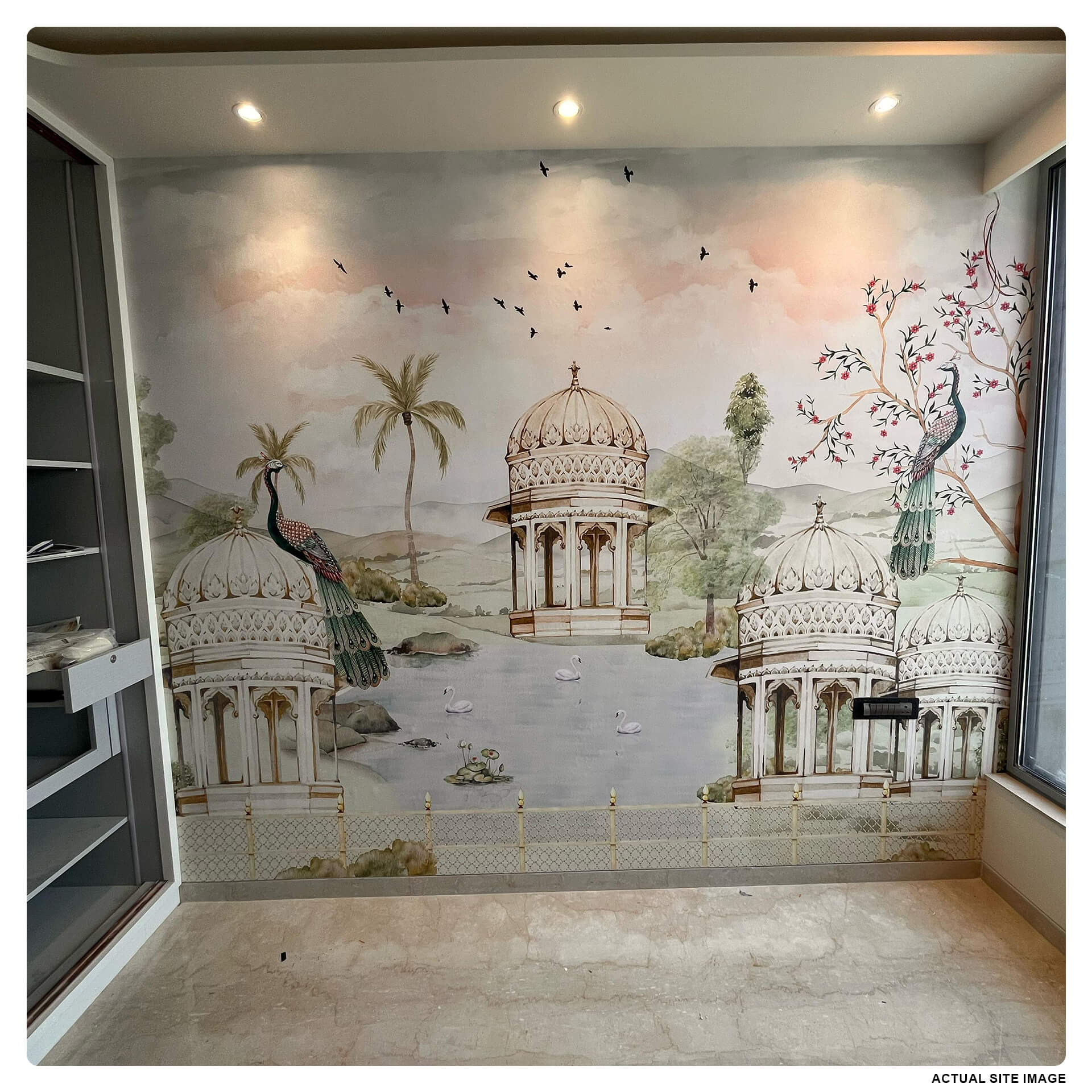 Indian Palace Wallpaper With Peacock Motifs in vibrant colors. This Indian Mahal wallpaper transforms any room into a sophisticated, artistic sanctuary. Perfect for living rooms, bedrooms, traditional or cultural spaces.