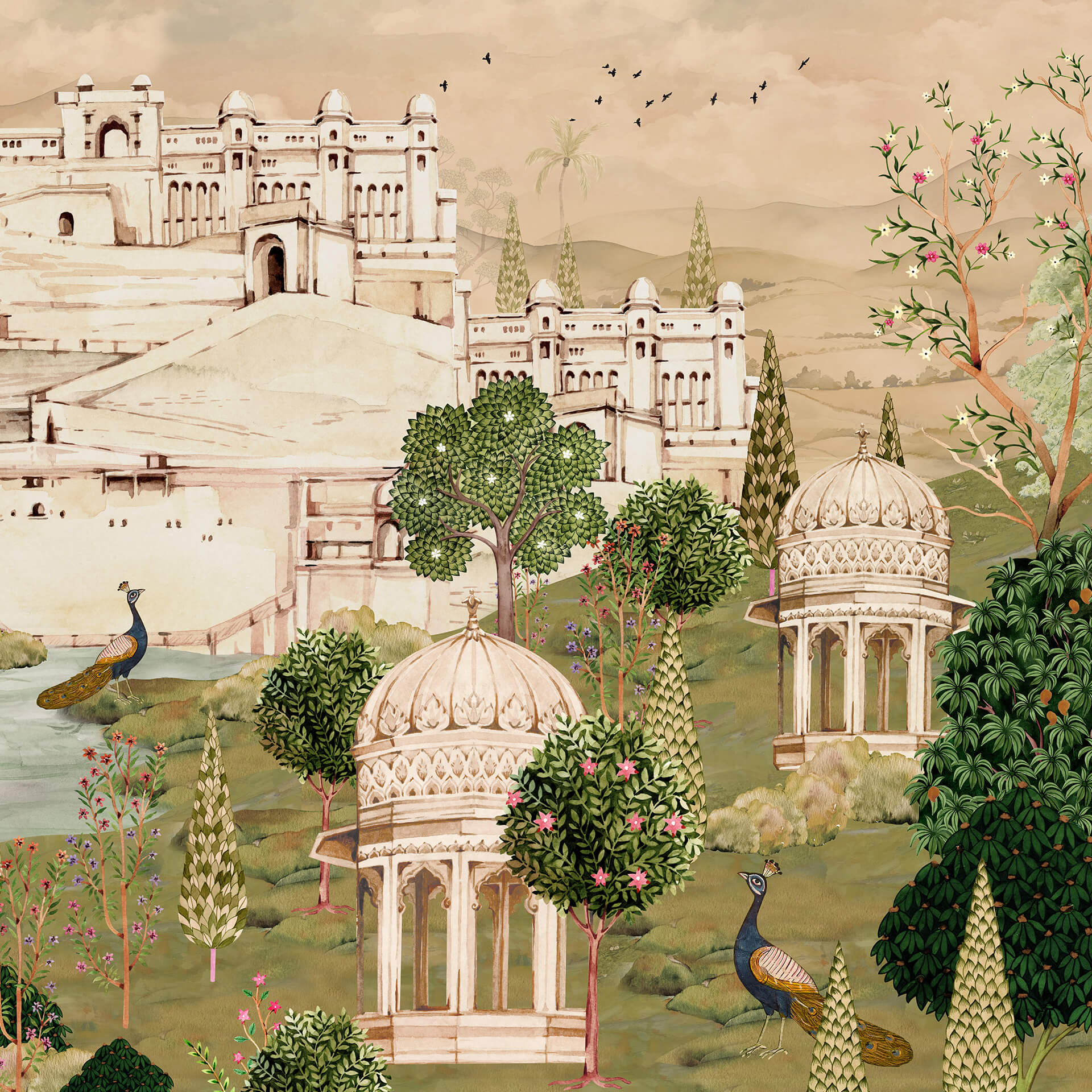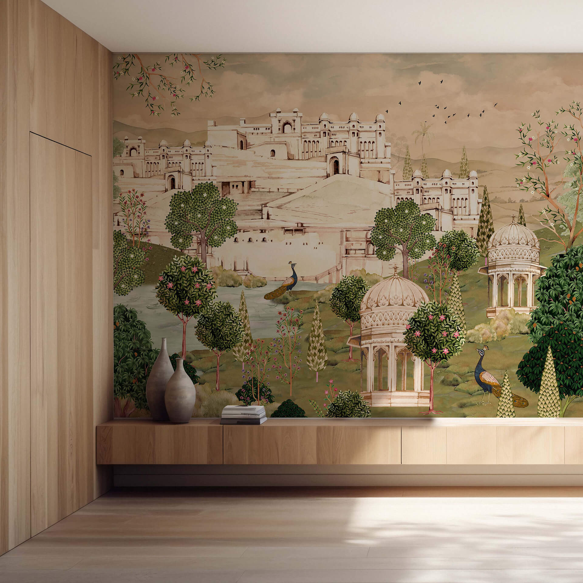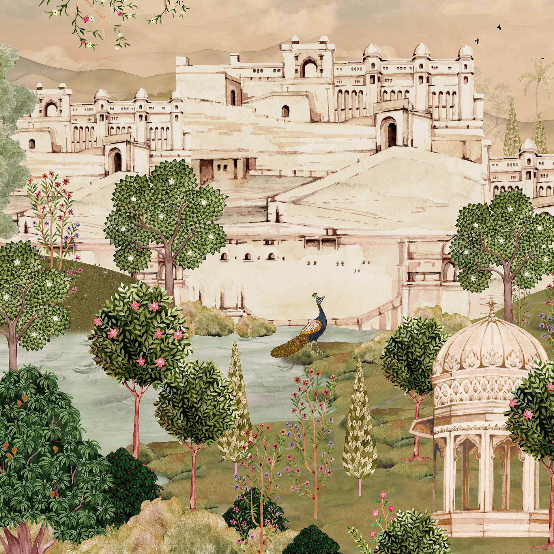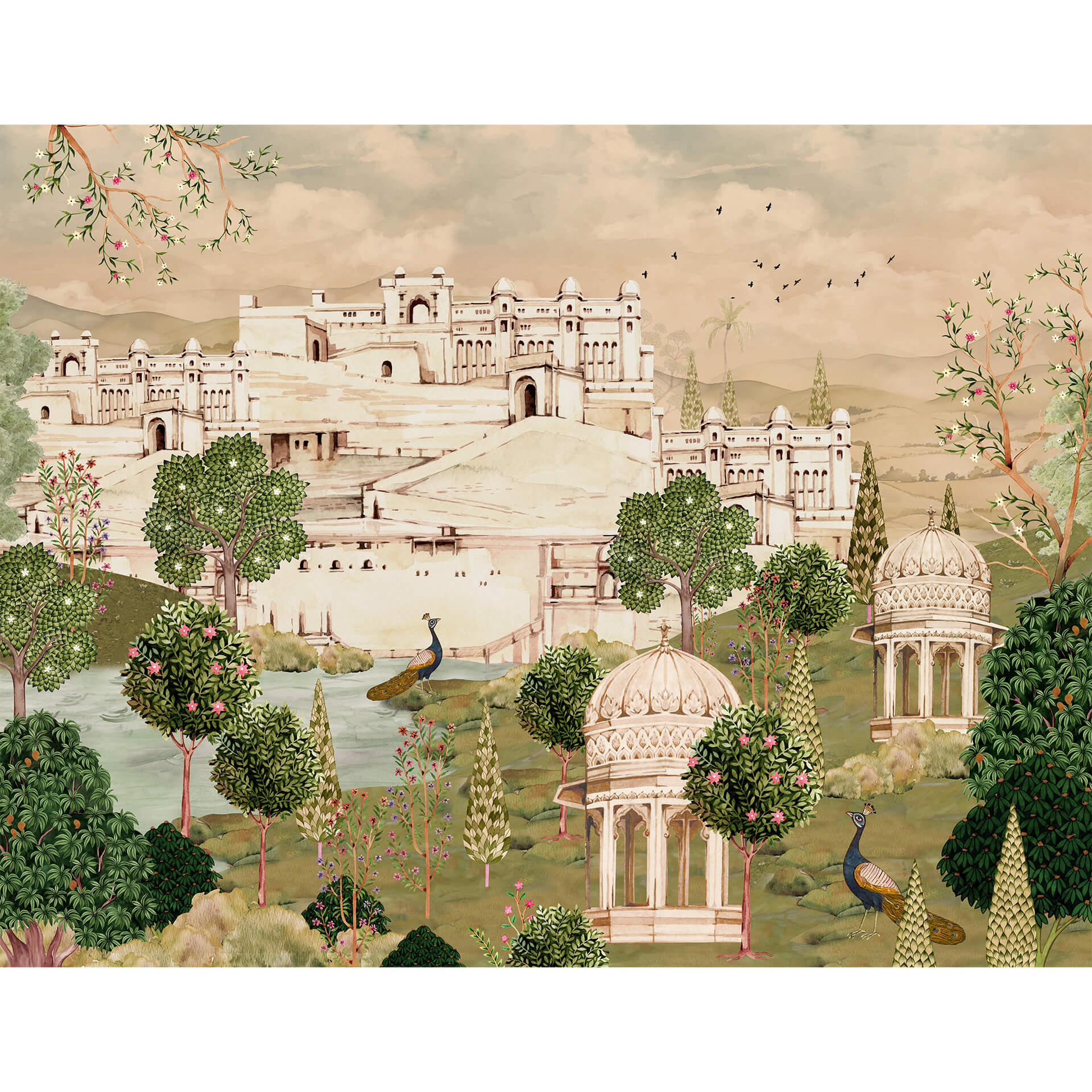 Luxurious Indian Palace Scenic Wallpaper, a stunning blend of traditional architecture, vibrant courtyards, and intricate heritage art. Inspired by the timeless beauty of Indian palaces and scenic haveli landscapes, this rich, panoramic wallpaper evokes cultural grandeur and storytelling charm.