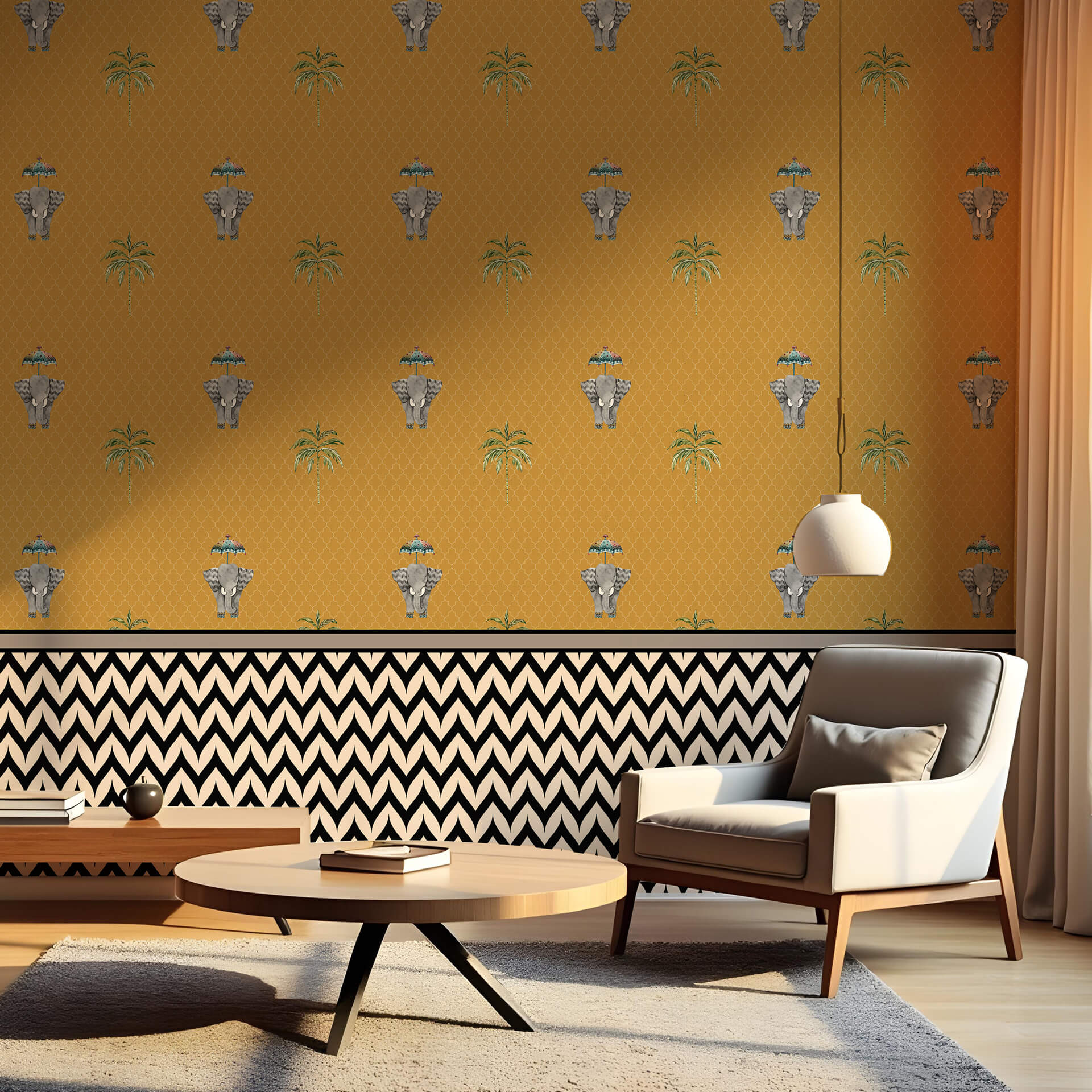 Royal Elephant and Palm Tree Pattern Wallpaper on Yellow Background. Ideal for living rooms, bedrooms, hallways, commercial spaces or feature walls, this wallpaper infuses a royal charm and lively ambiance to your home or office decor.