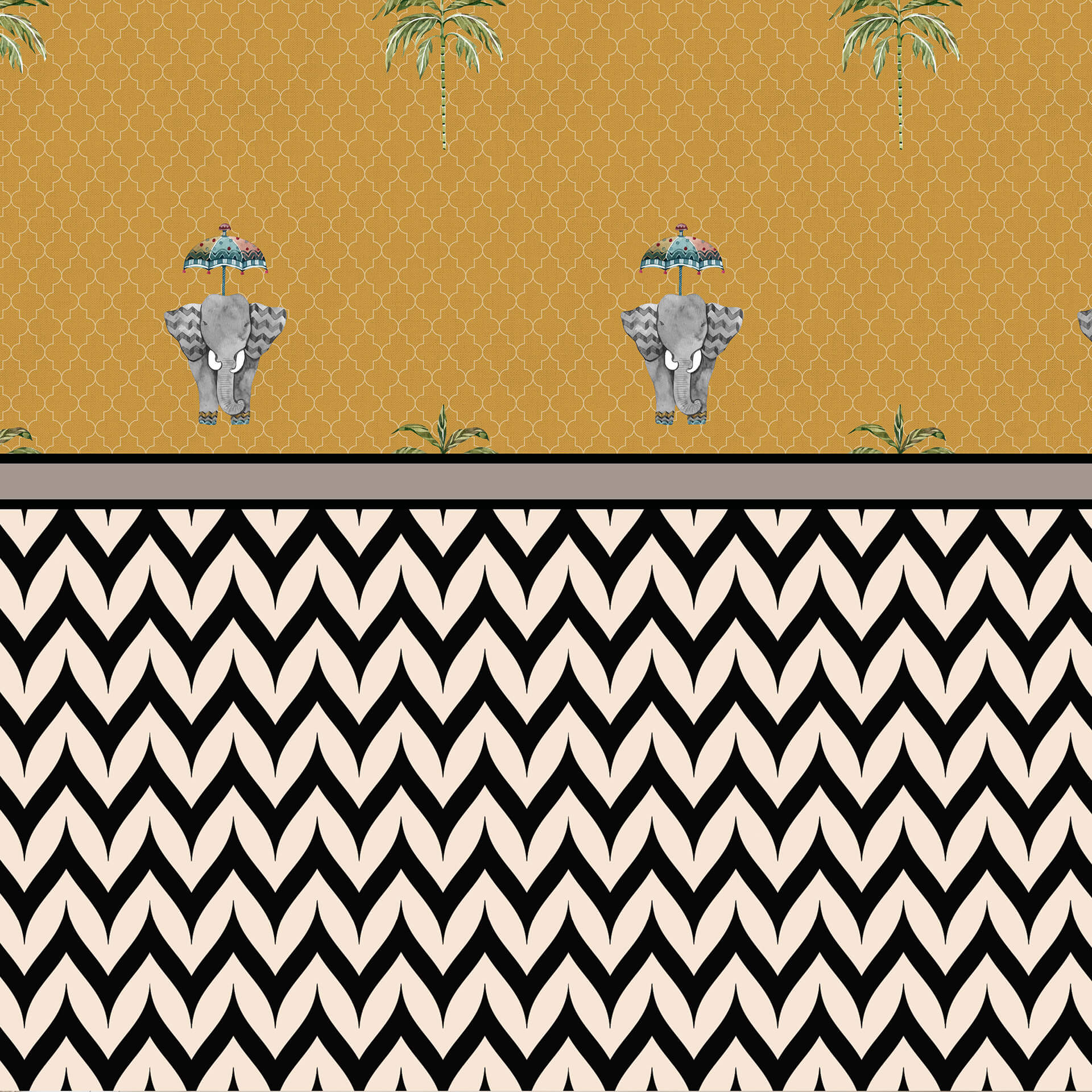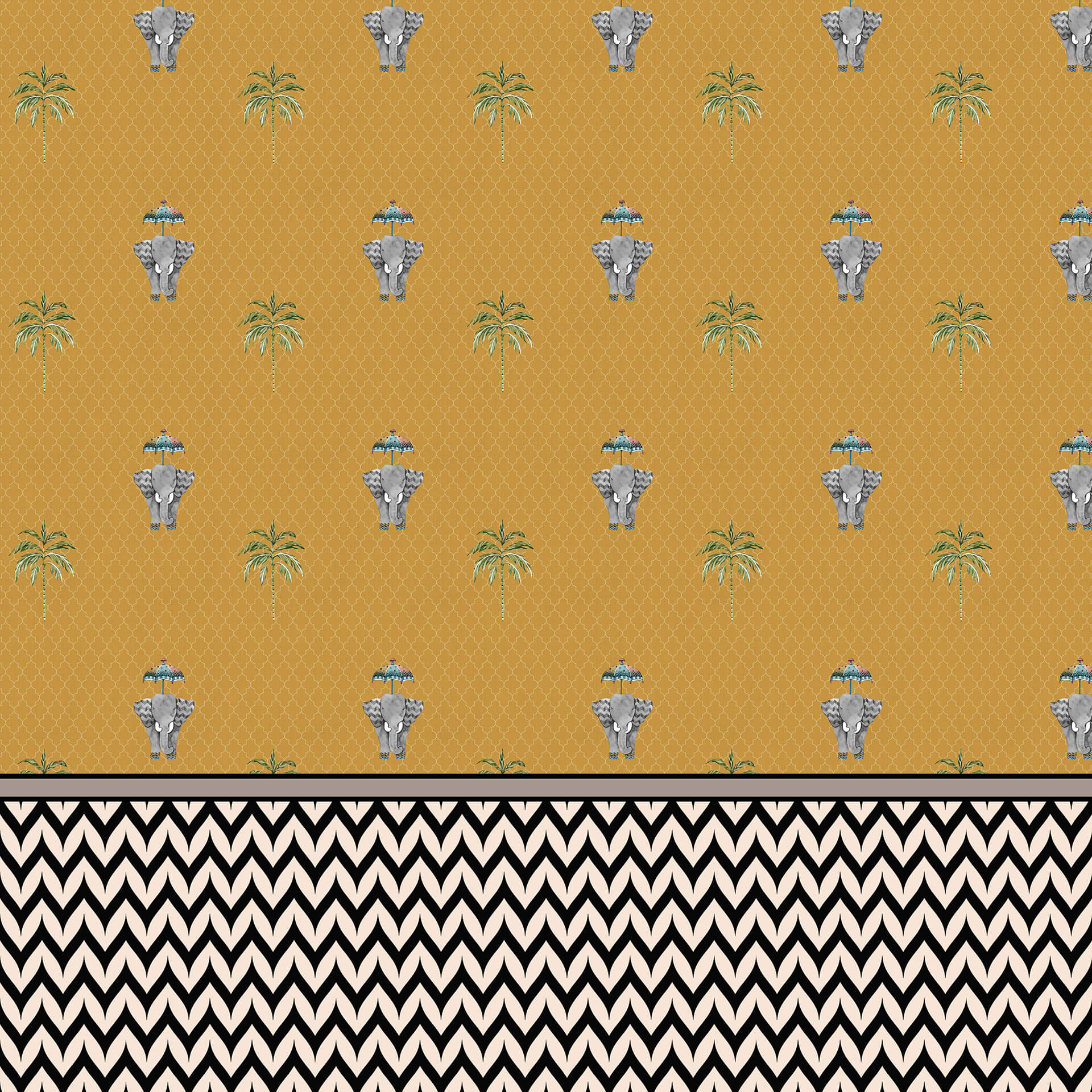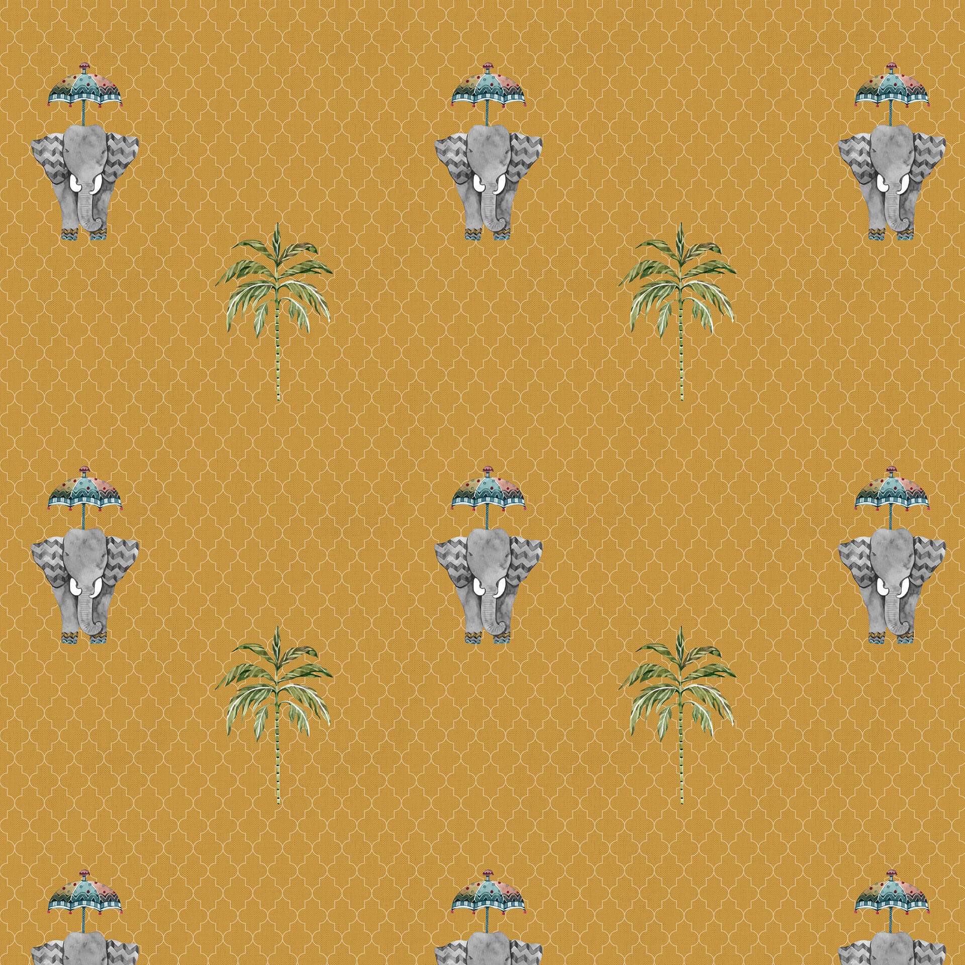 Majestic Parade: Royal Elephant and Palm Tree Pattern Wallpaper on Yellow Background