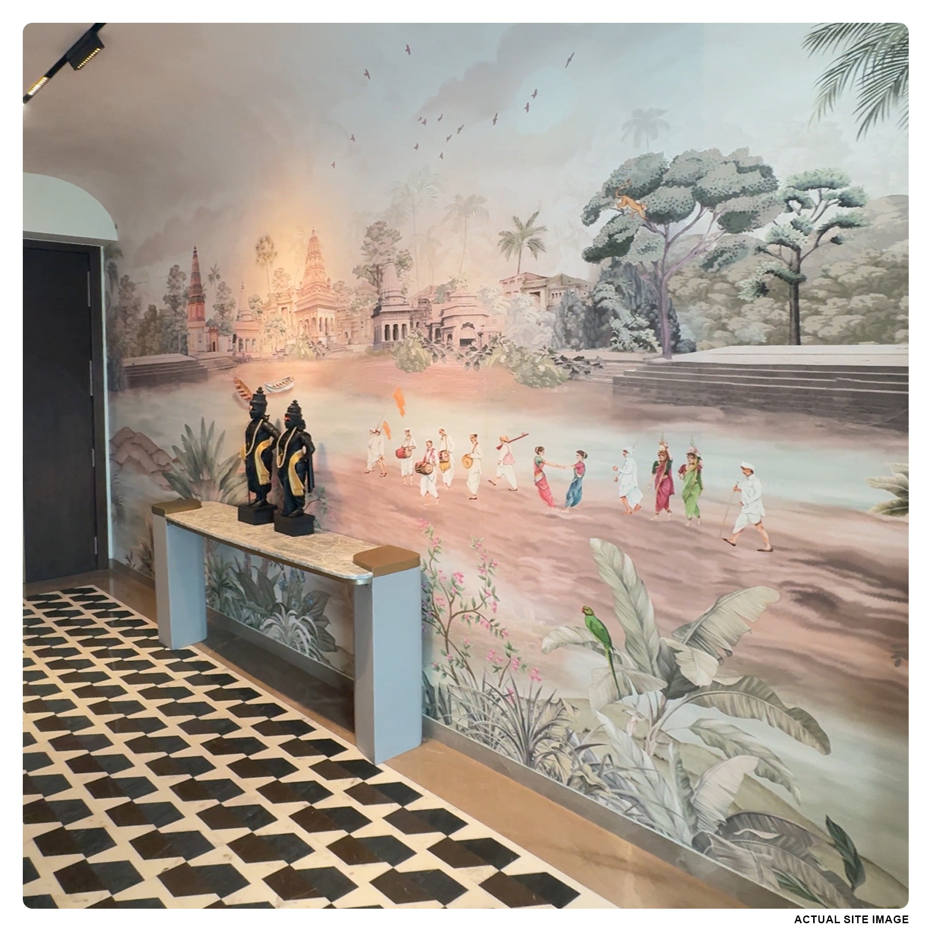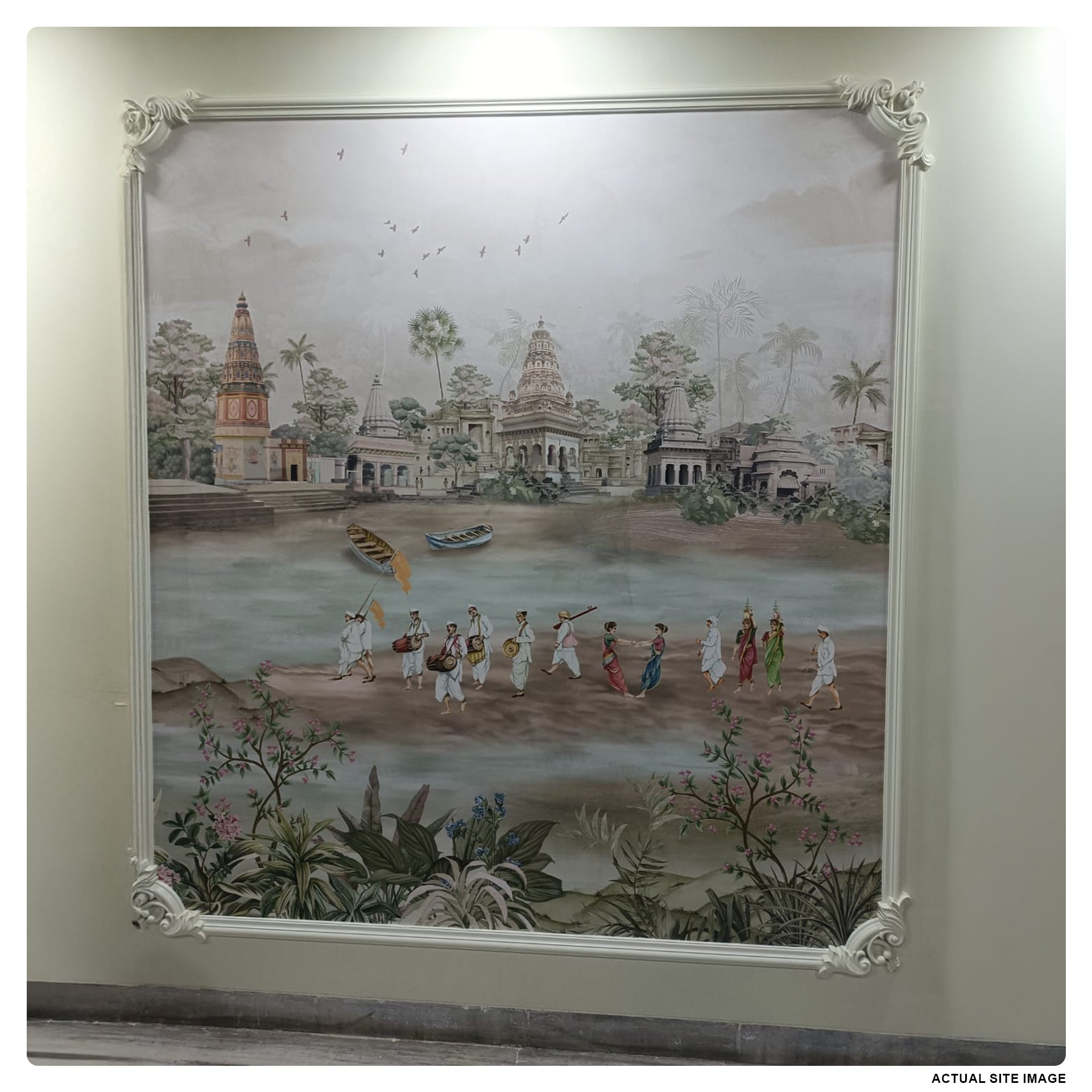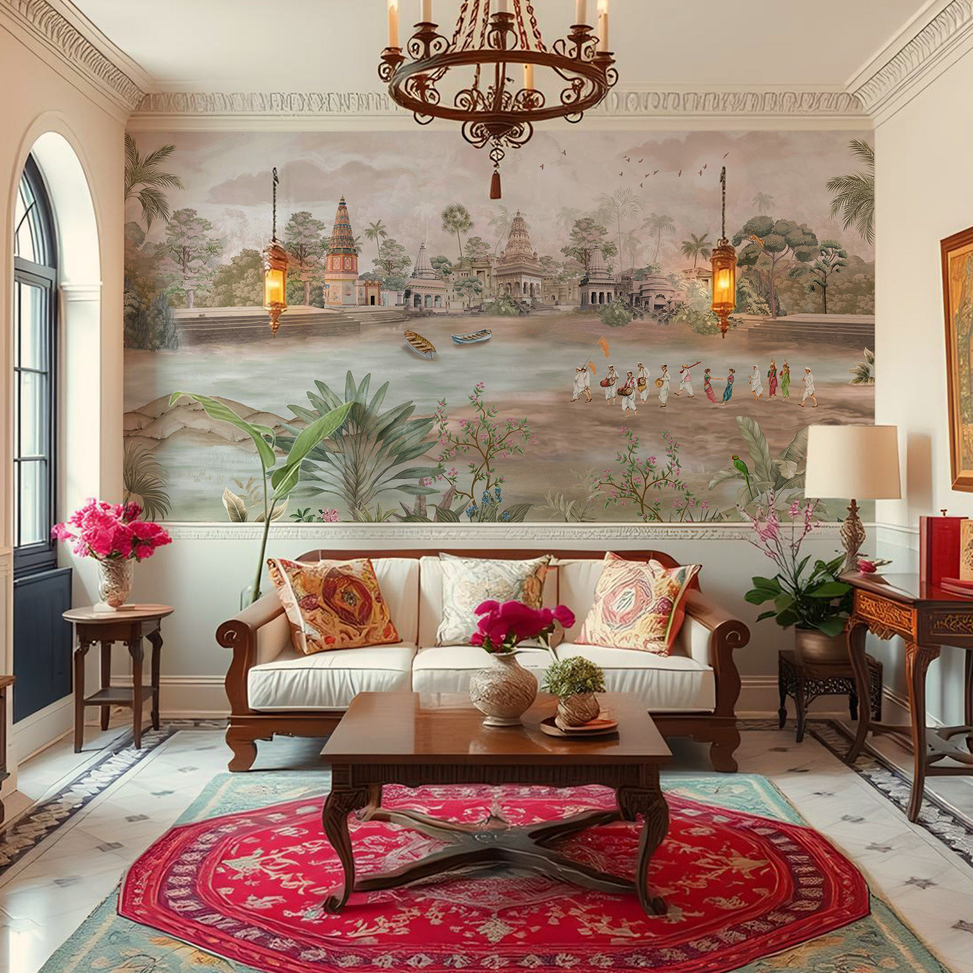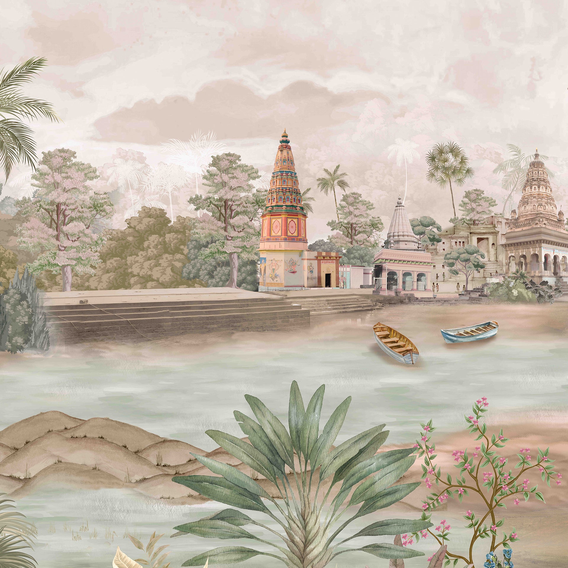 A tranquil riverfront scene in India featuring historic temples, boaters, and a procession of people in traditional attire set among lush tropical plants and soft pastel skies.