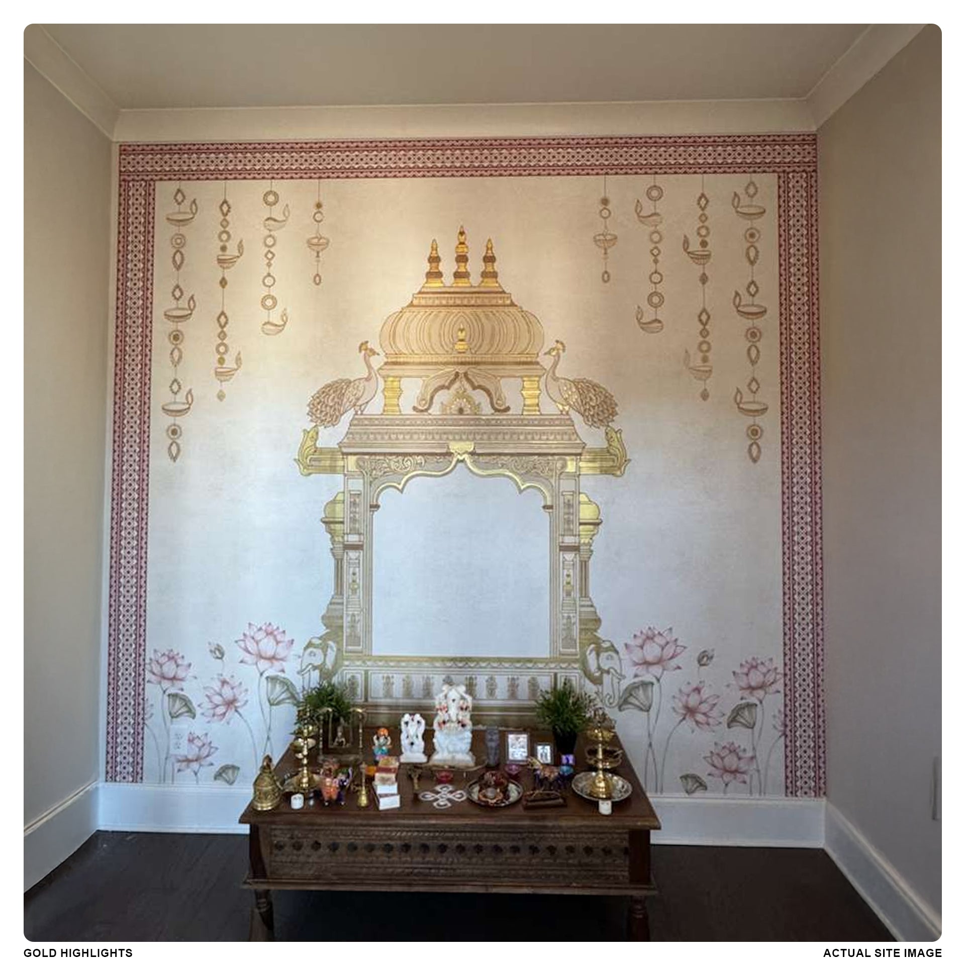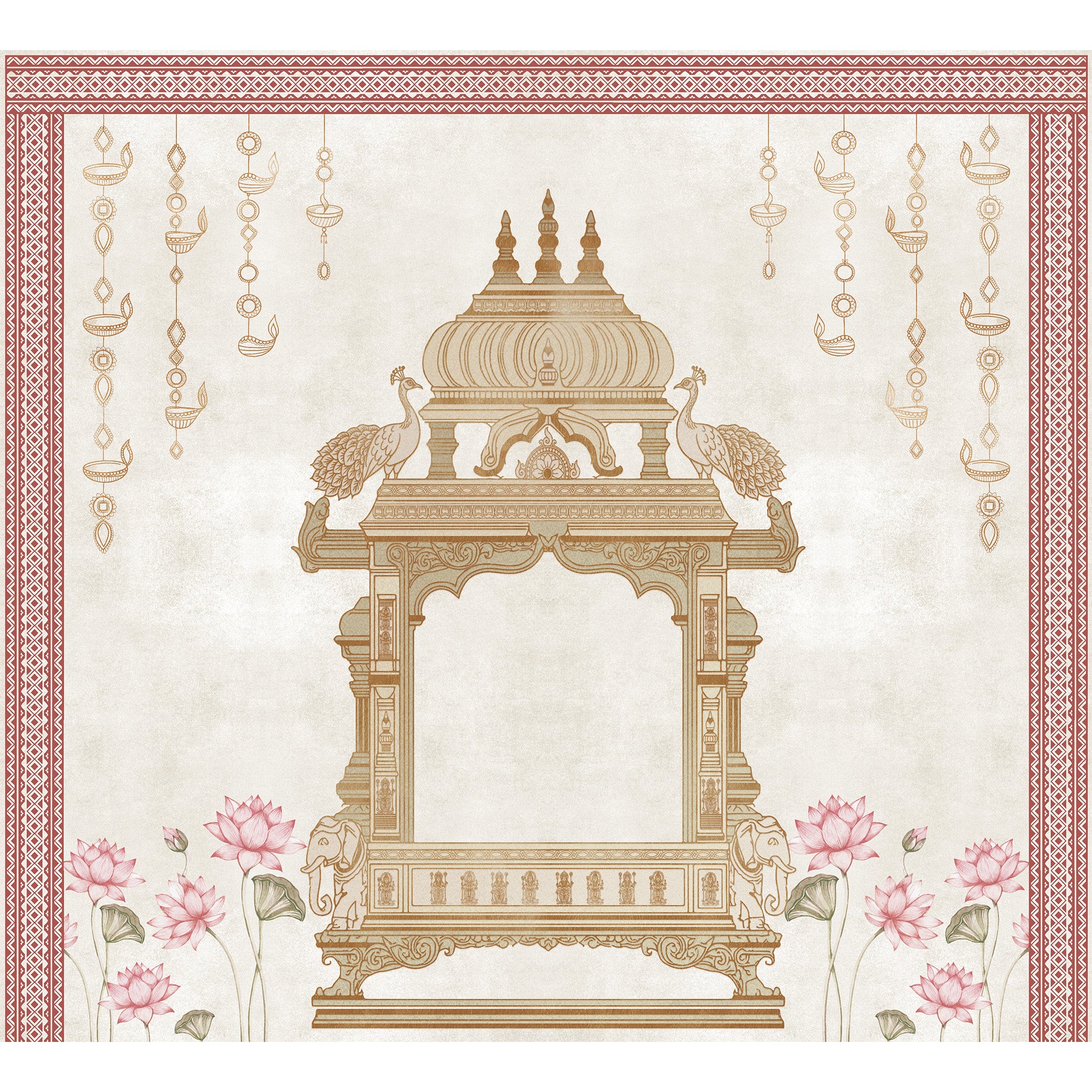 Elegant ornamental Indian mandap frame decorated with peacocks, lotus flowers and hanging lamps in a traditional temple style