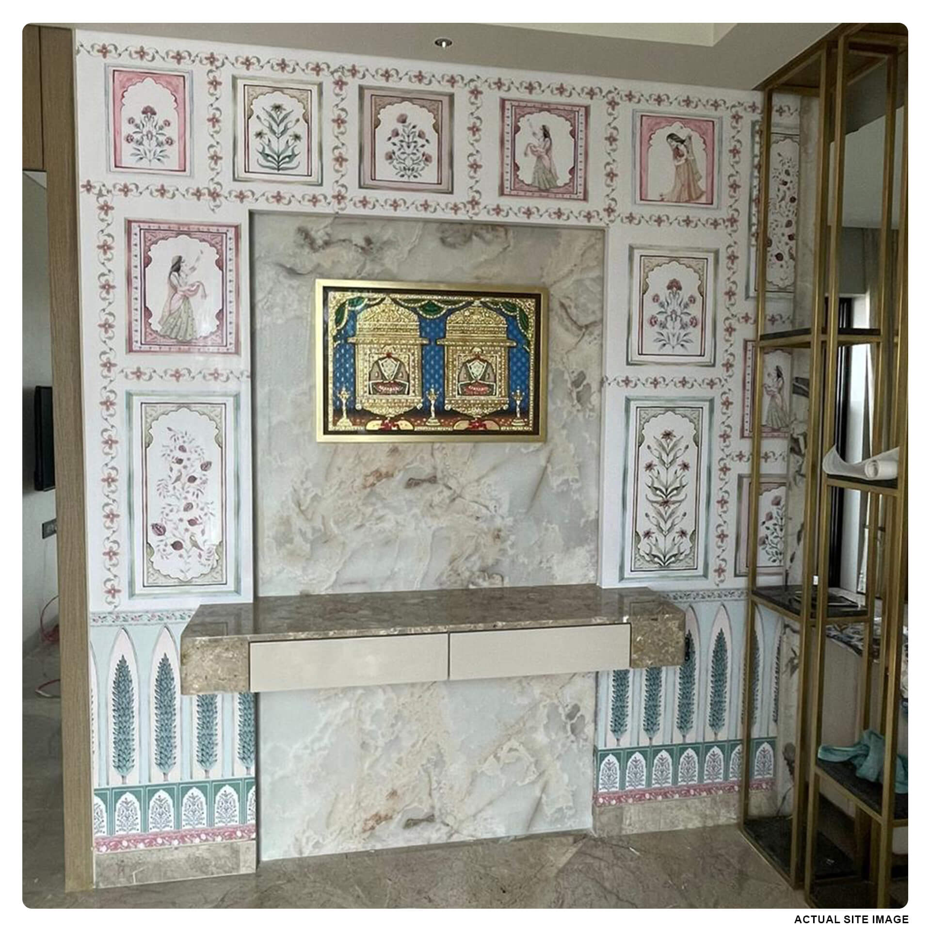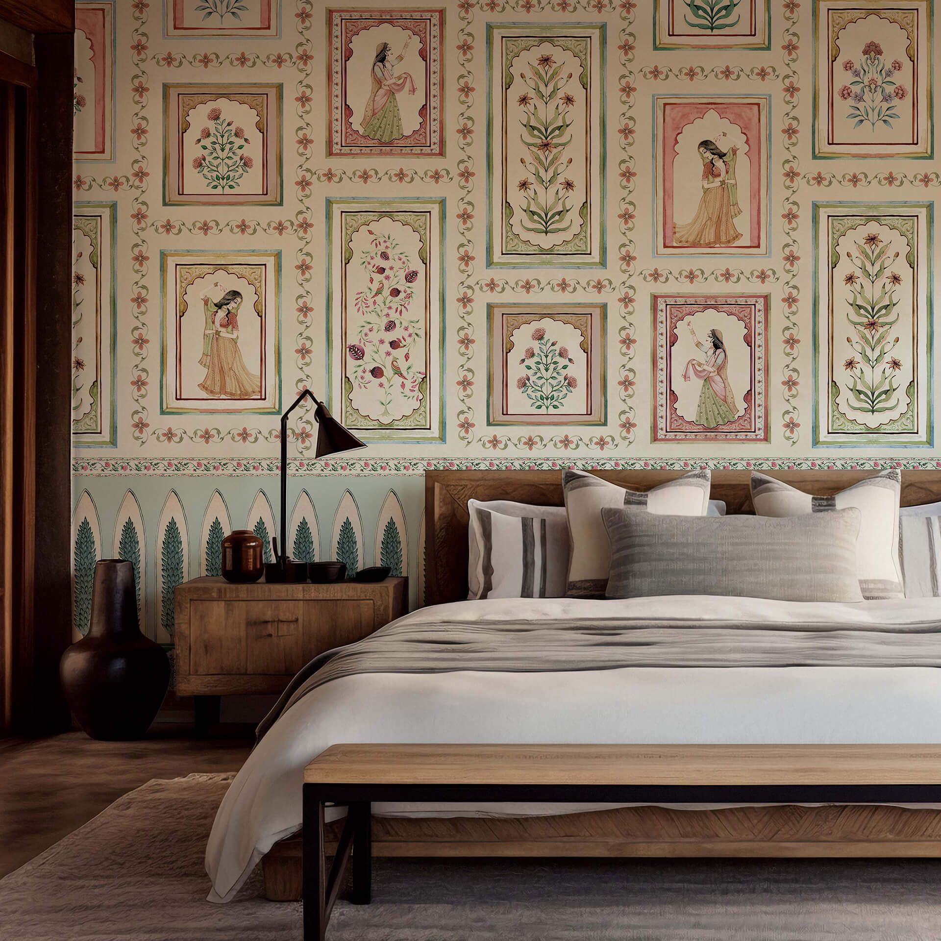 Indian Darbar Wallpaper with Indian Women & Floral Motifs, perfect for living rooms, bedrooms, or cultural spaces.