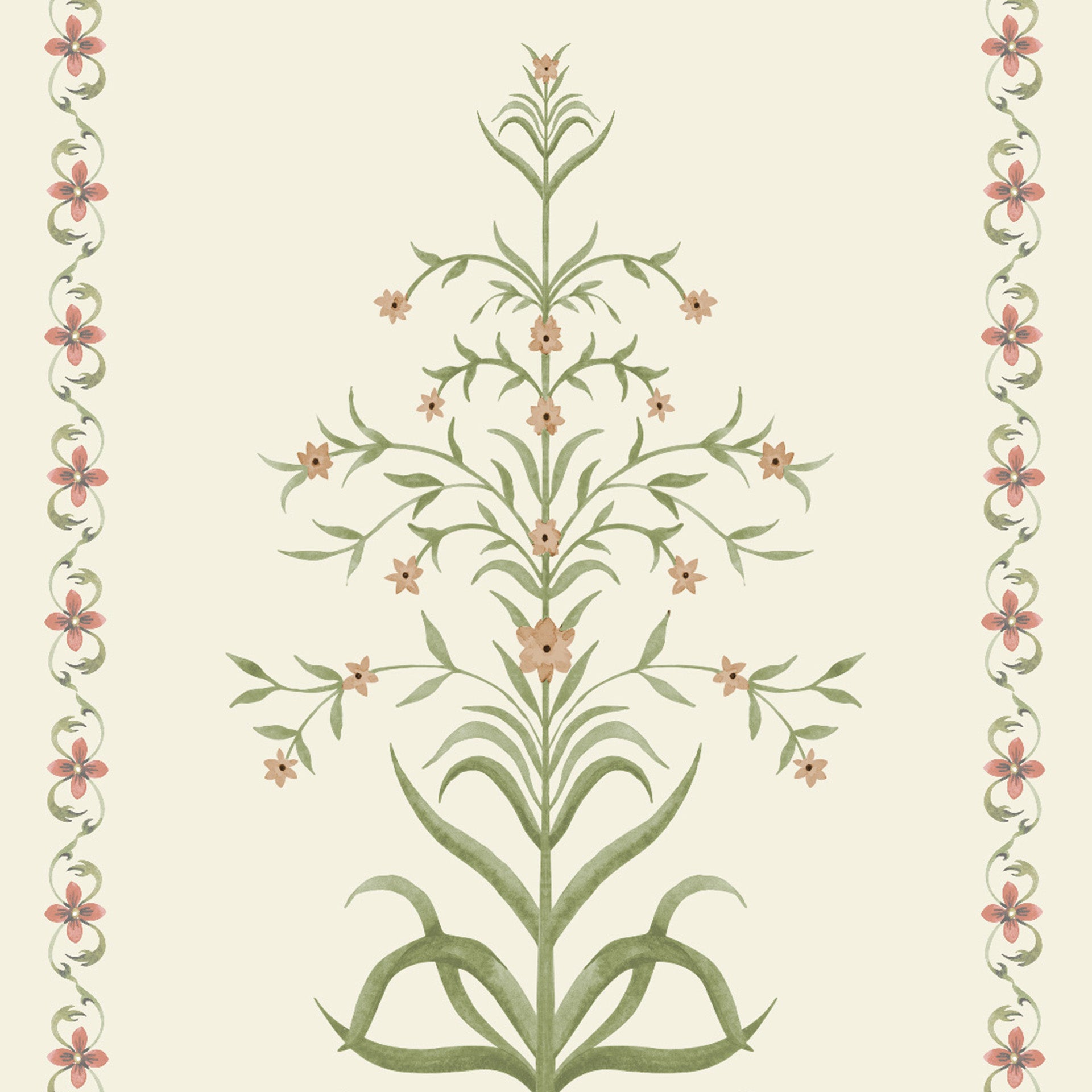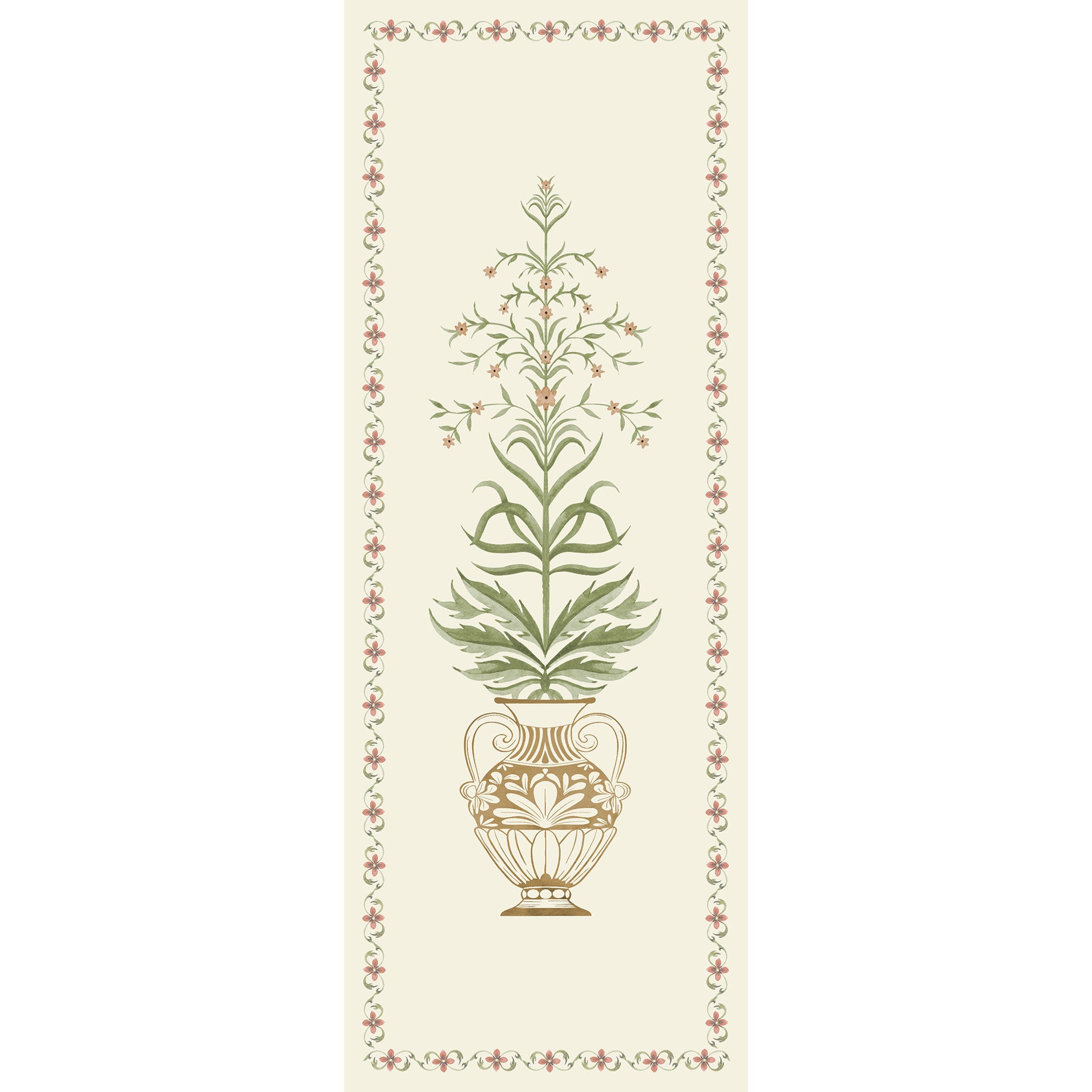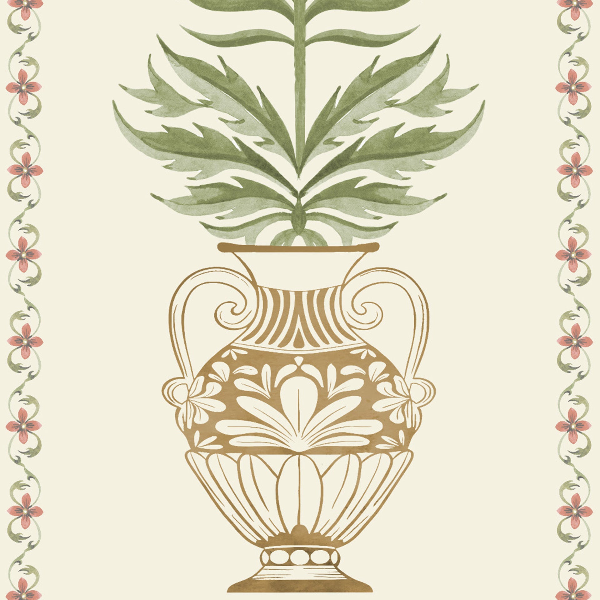 Delicate floral vase illustration set in a vertical vintage botanical panel with an ornamental border and muted pastel palette.