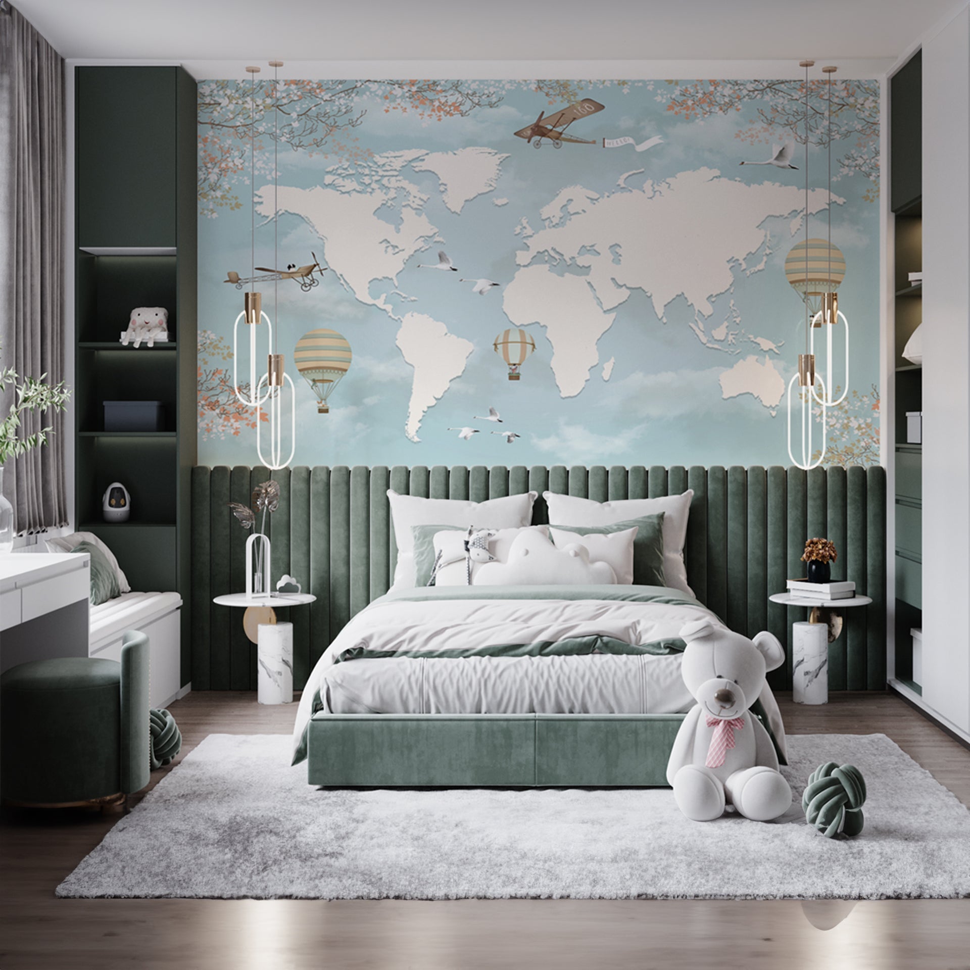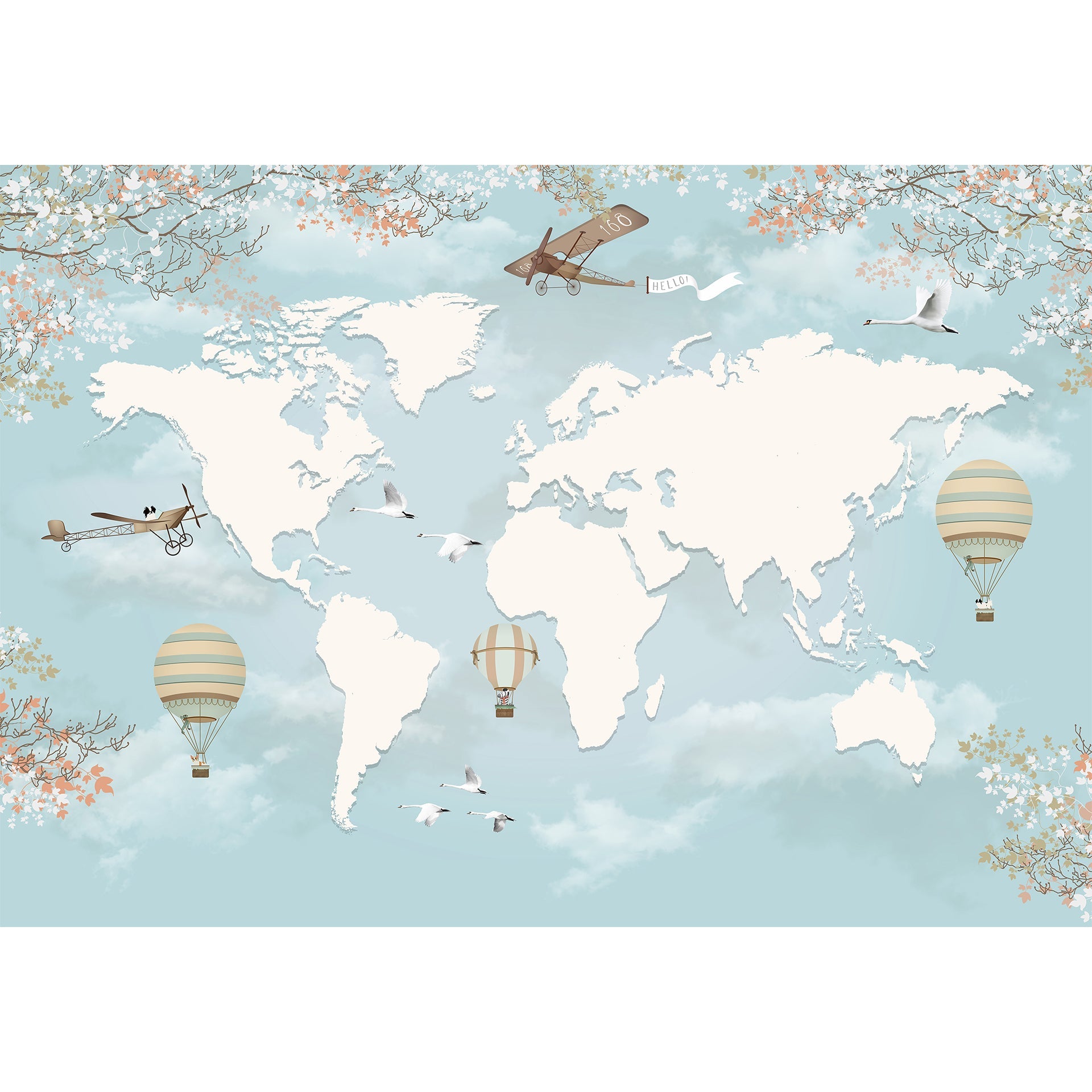 3d wallpaper world map design with planes hot air balloons on sky background for kids