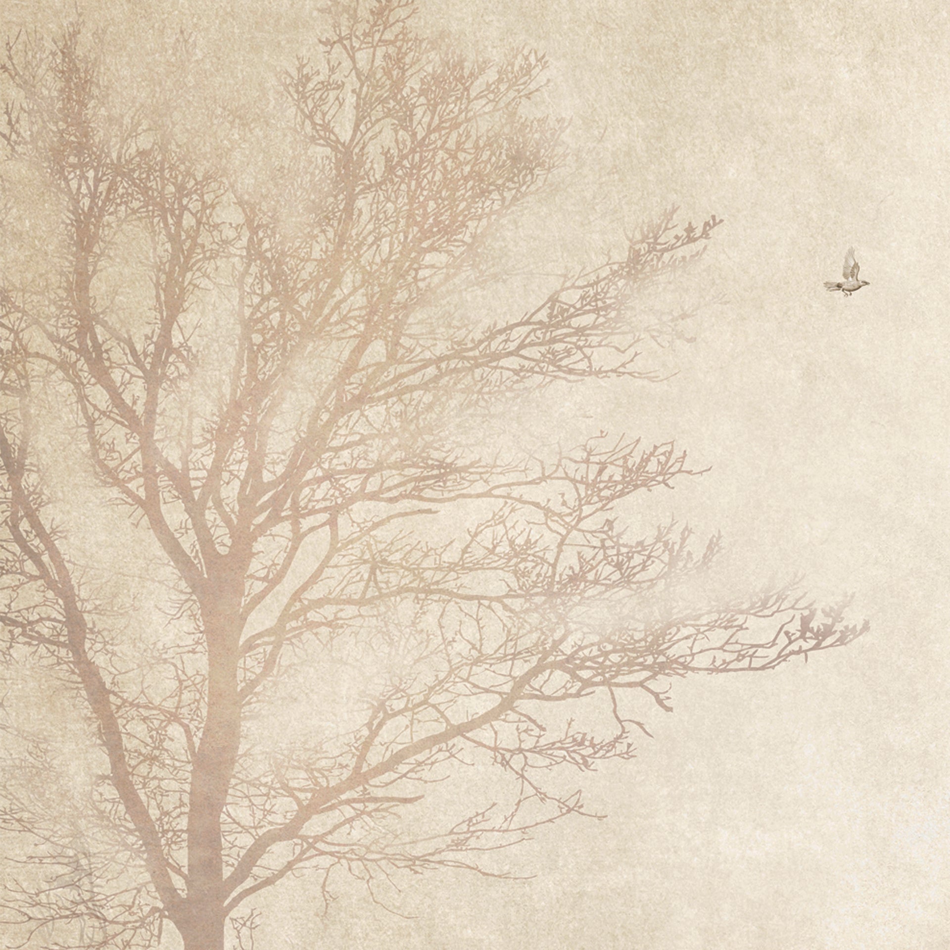 A tranquil, sepia-toned scene of leafless trees against a soft sky. Small birds glide between branches, evoking nostalgia and quiet beauty in a vintage woodland setting.