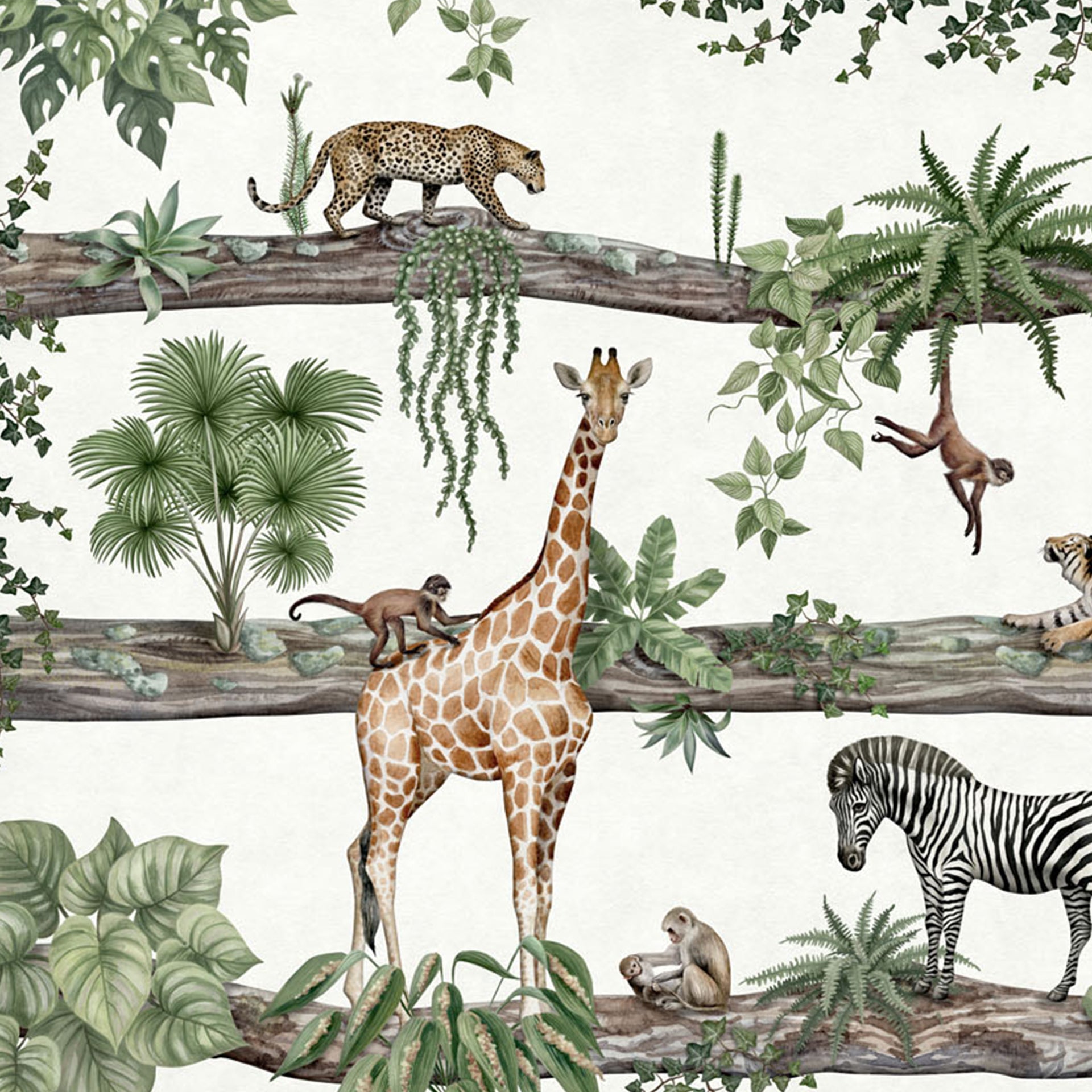 Amazing-Animals: Colorful Jungle Wallapaper With Giraffe Zebra Tiger Monkey Leopard On Wooden Logs-Sample
