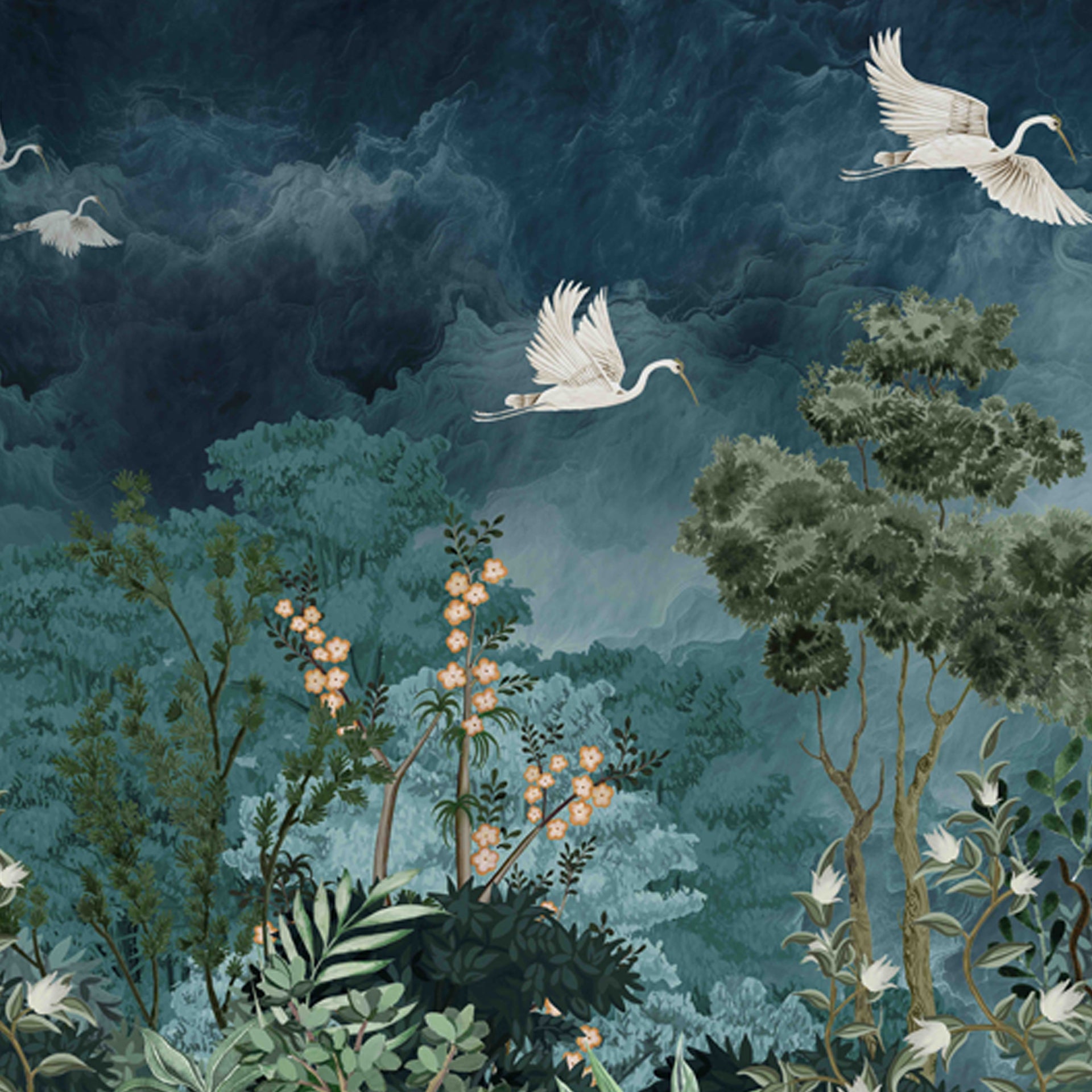 A lush tropical jungle scene at dusk with white birds in flight over dense foliage. Deep blue sky, misty tones, and varied plants create a tranquil, mysterious atmosphere of nature.