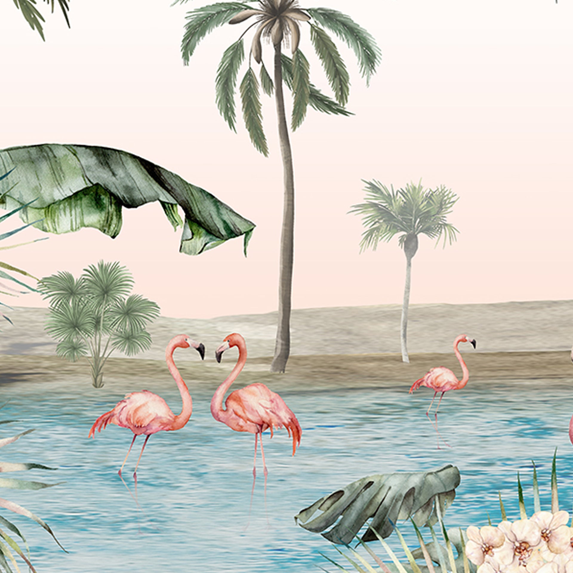 Bright tropical scene featuring pink flamingos wading in a lagoon framed by tall palms. A soft pastel sky and calm waters evoke a relaxing vacation mood and natural paradise.