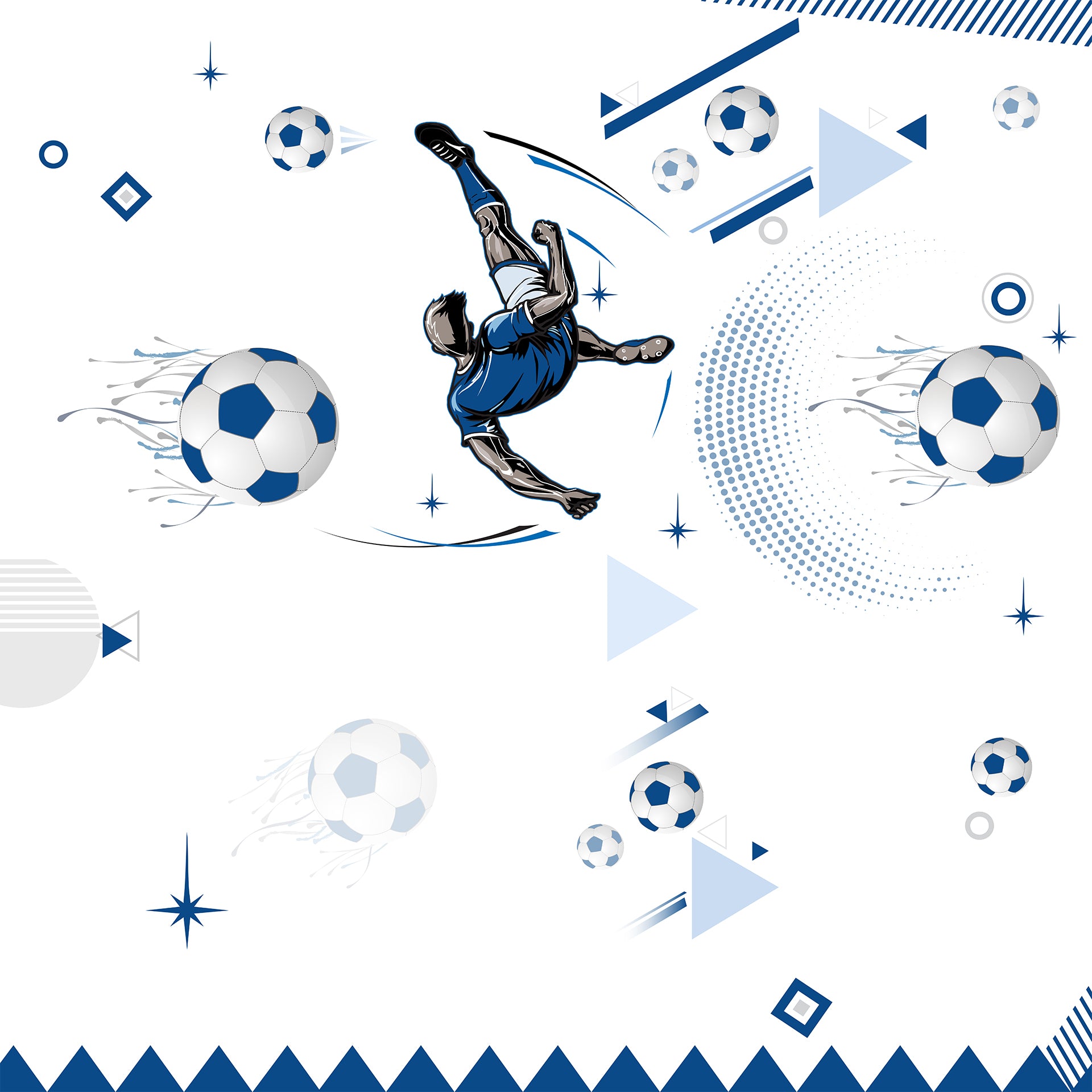 Vibrant, modern artwork featuring a soccer player mid-kick surrounded by blue geometric shapes, motion trails, and orbiting balls. Energetic and athletic, it conveys speed, movement, and competitive spirit.