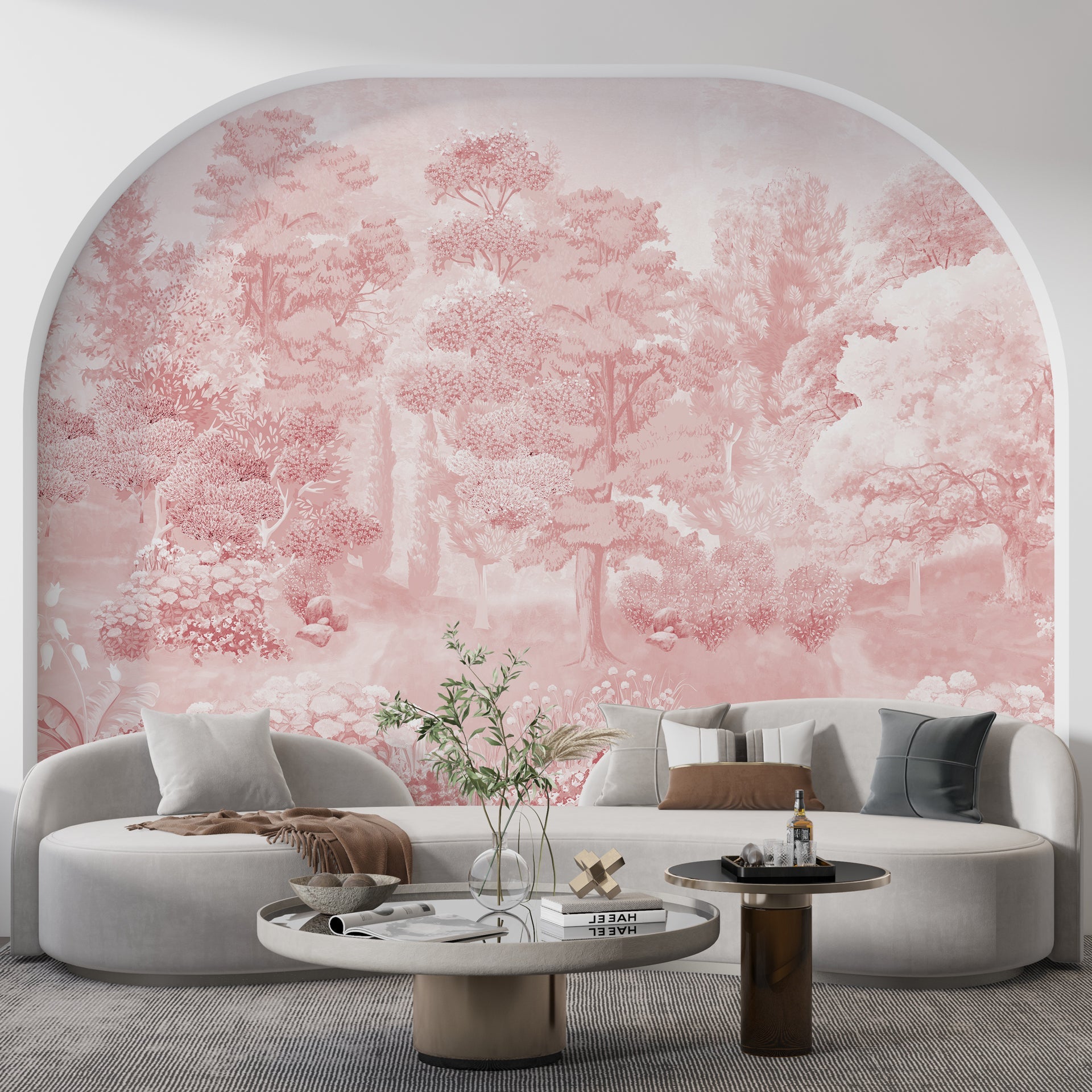 Enchanting pink-toned forest scene featuring a variety of trees, plants, and detailed textures, creating a calming impression and a peaceful, serene atmosphere.