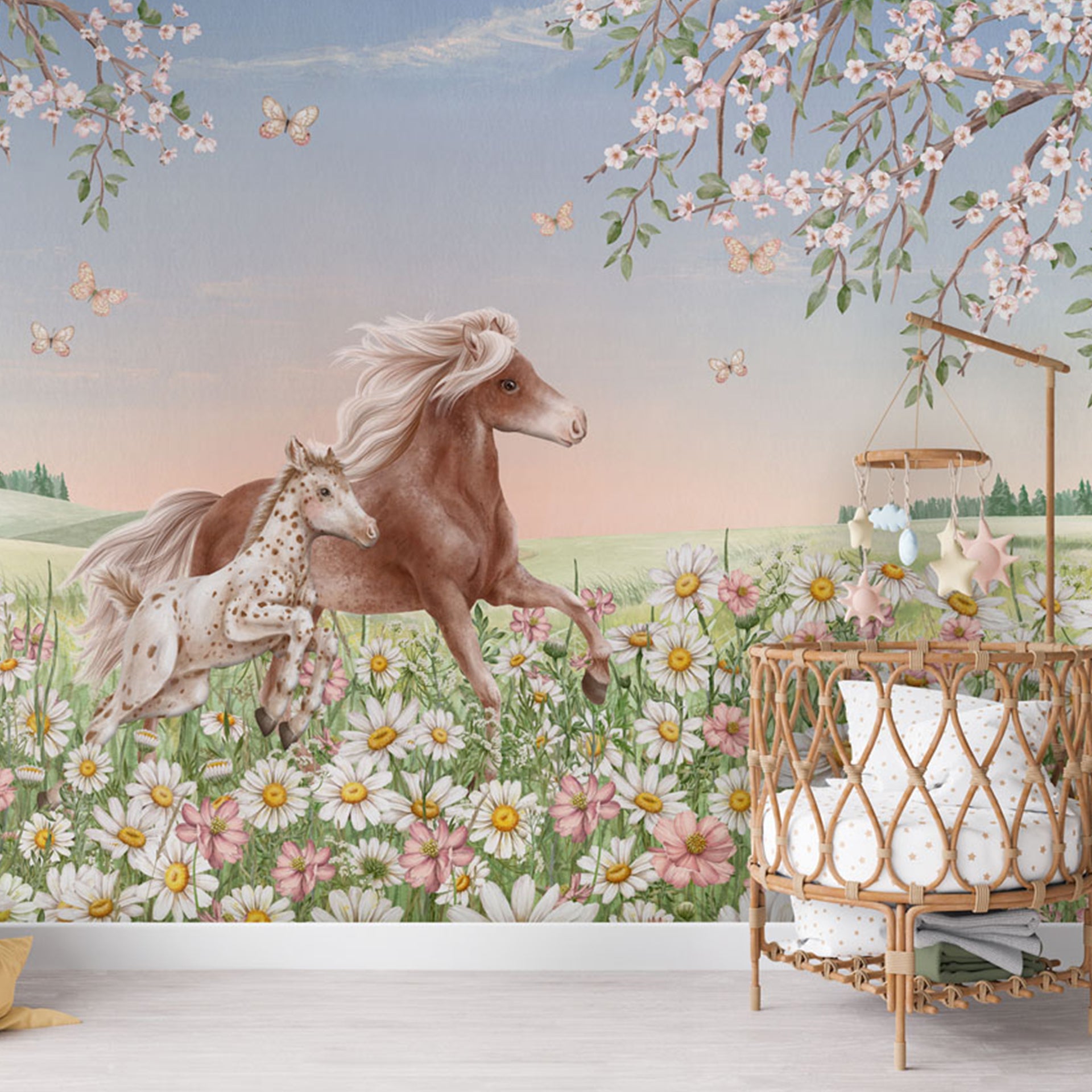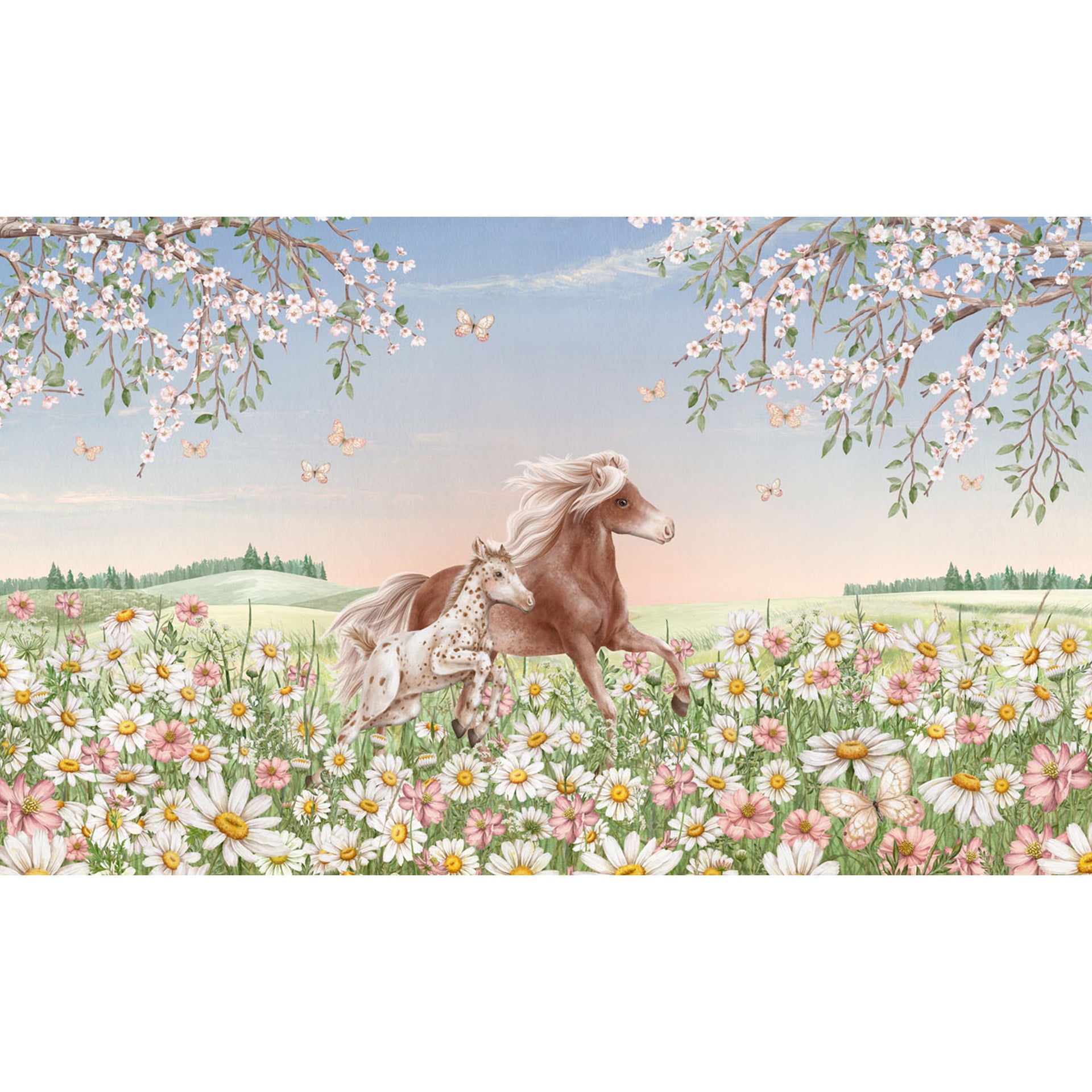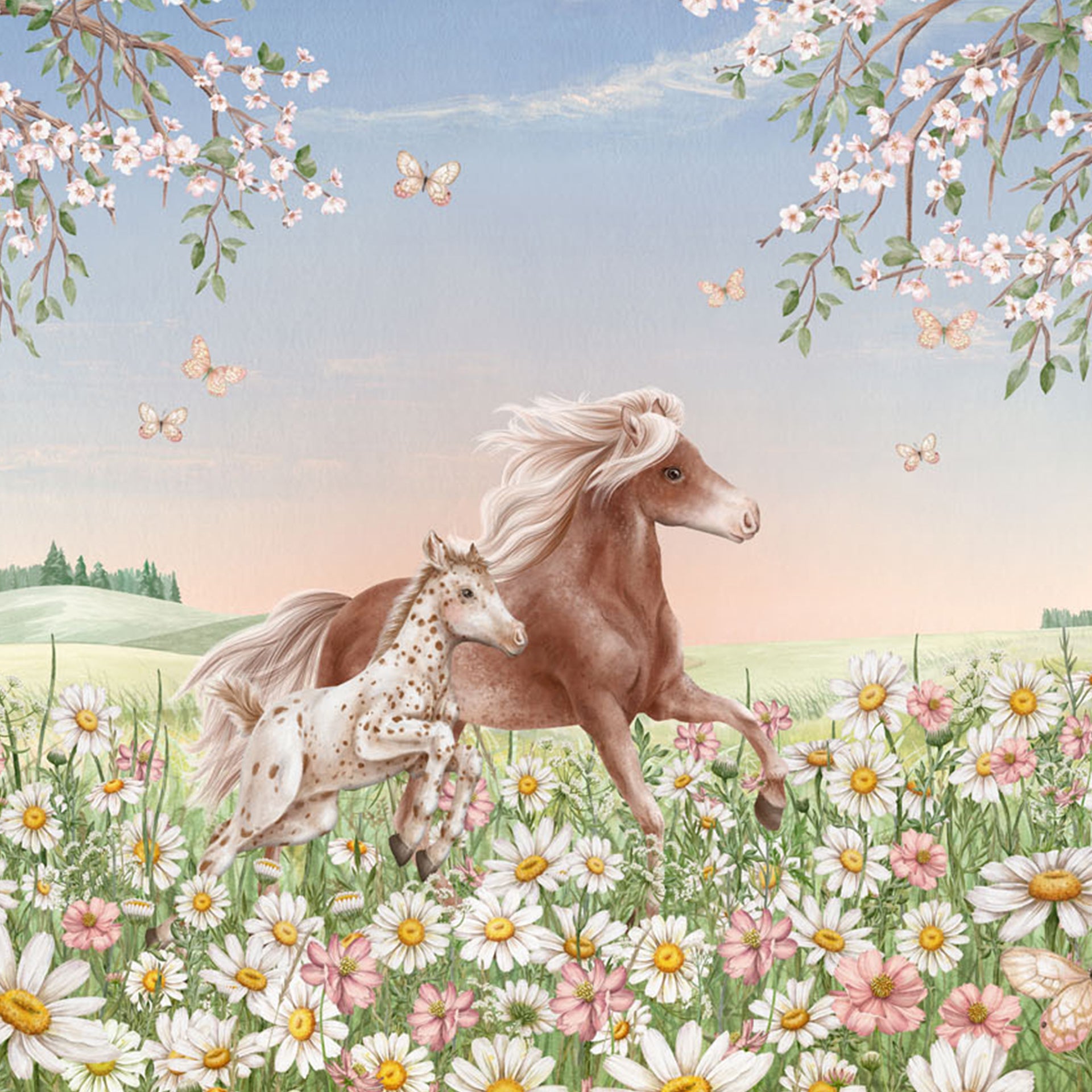 A tranquil spring scene features a brown horse and foal galloping through a daisy-filled meadow, framed by cherry blossoms and fluttering butterflies beneath a soft pastel sky.