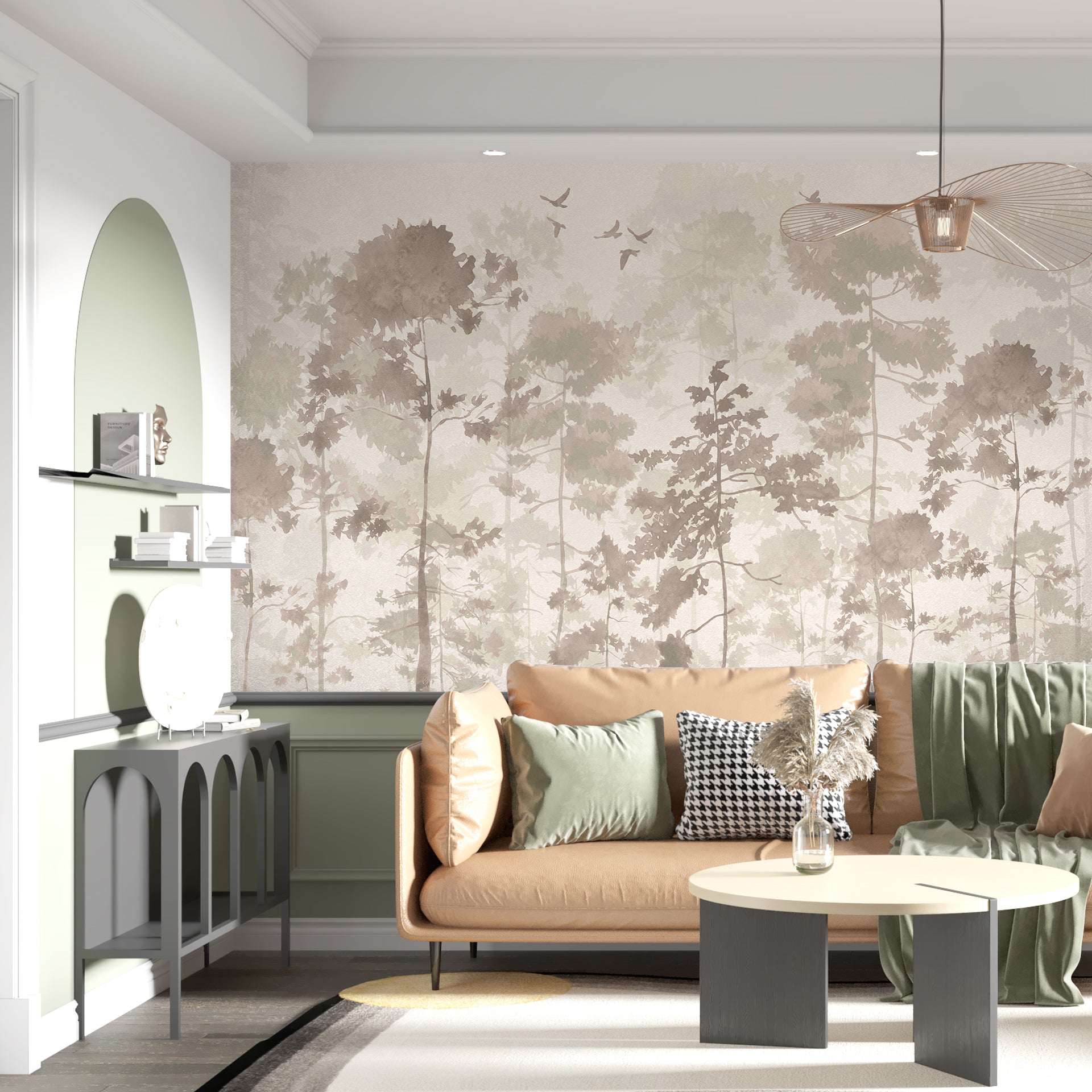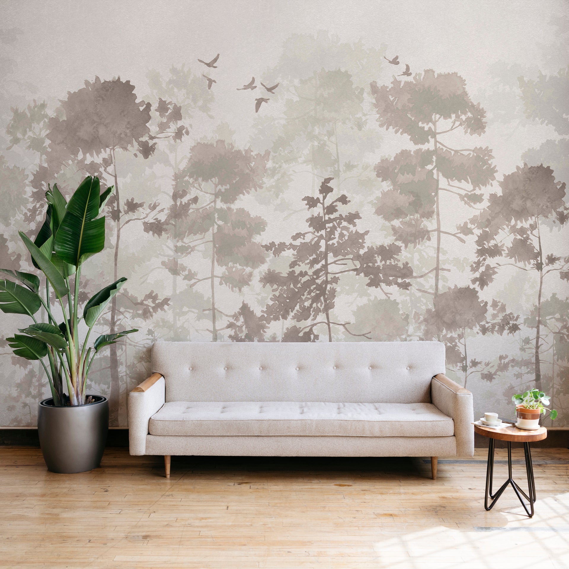 Mistwood Canopy: Soft Forest Scene With Silhouetted Trees And Subtle Birds In Mist-Sample