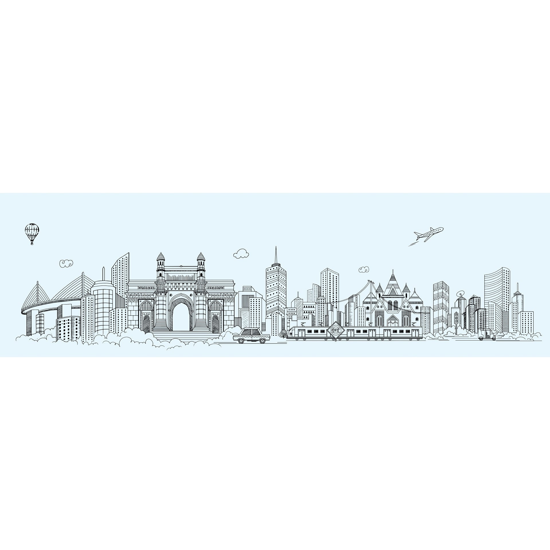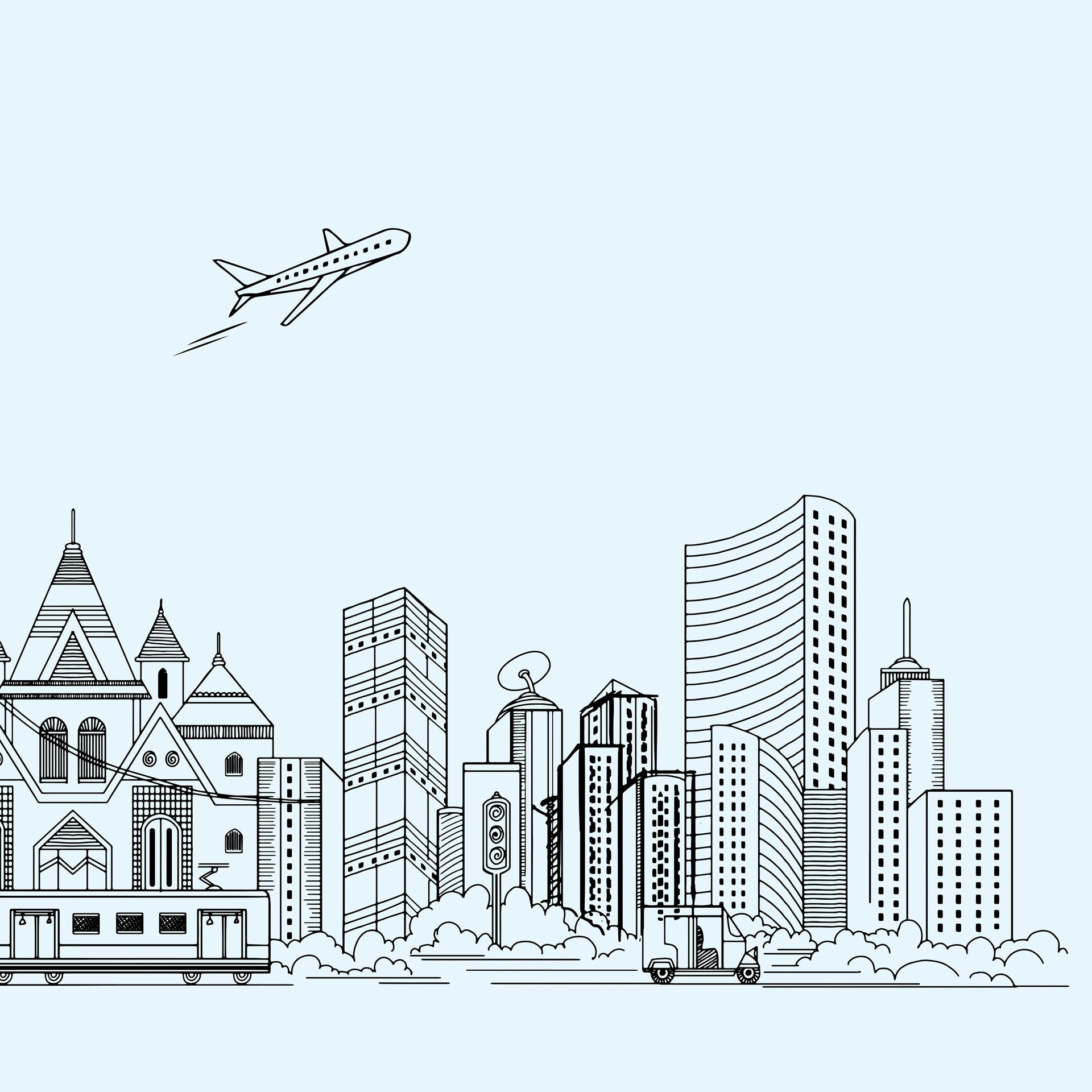 Illustrated Skyline Featuring Landmark Architecture and Modes of Transportation-sample