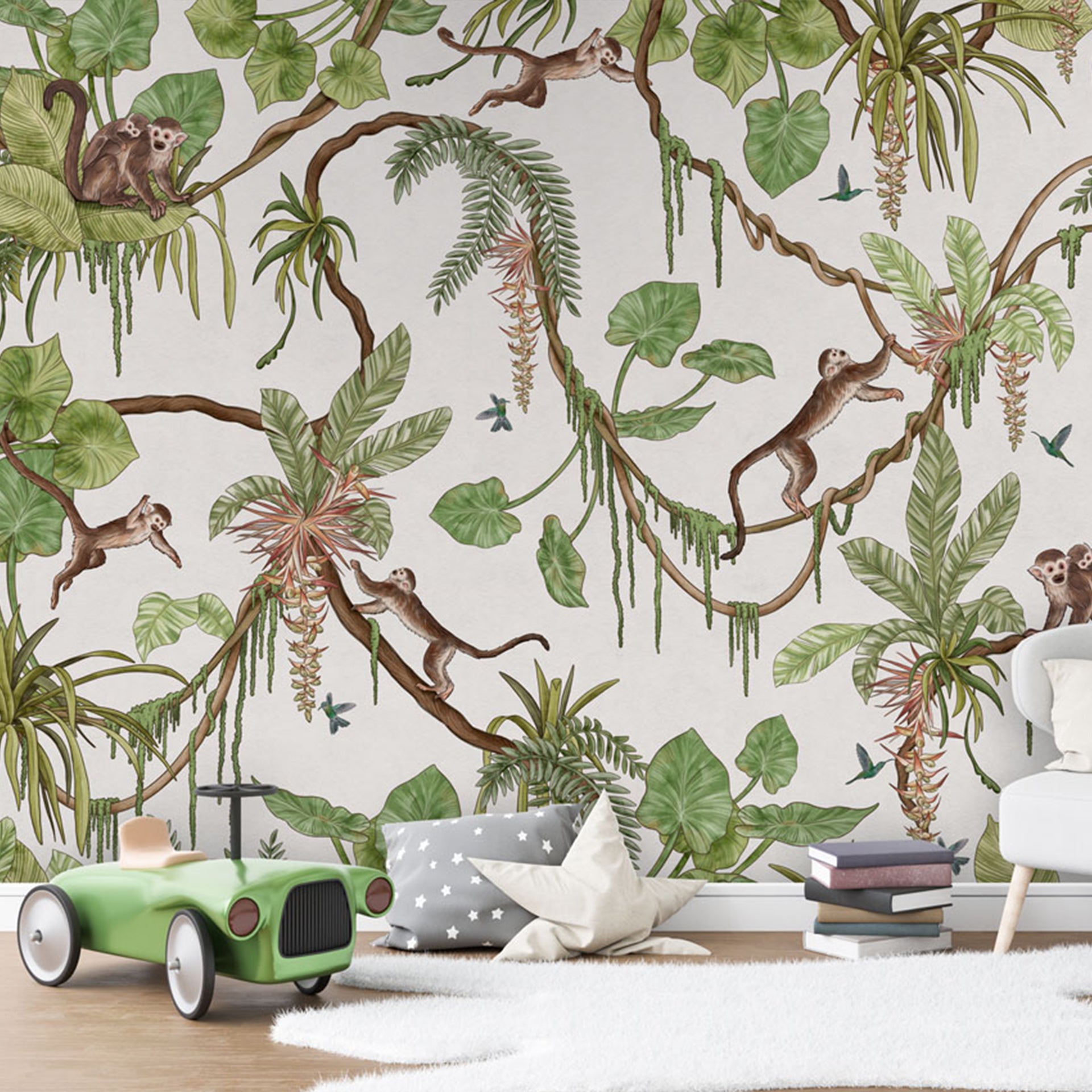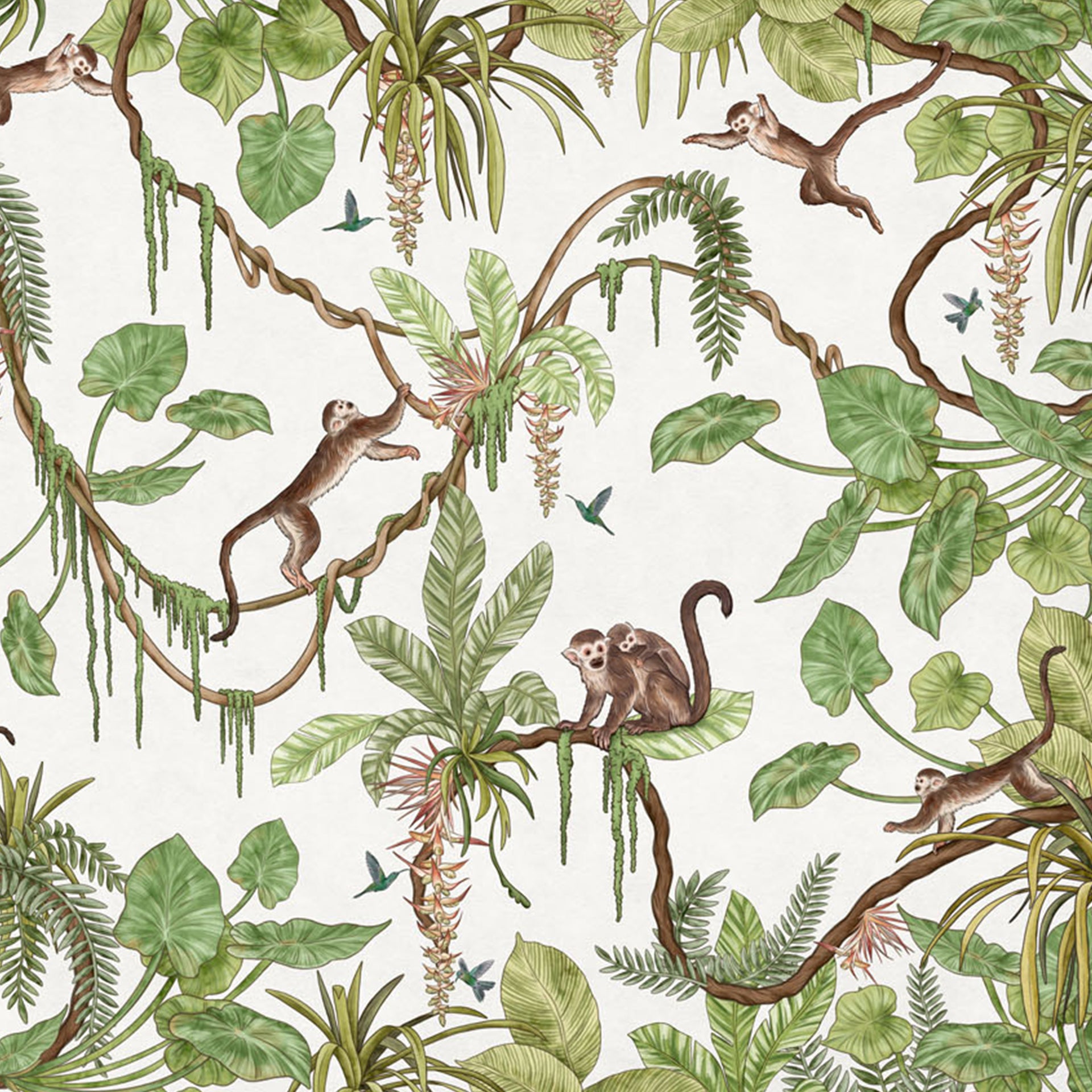 Playful-Monkeys:Tropical Jungle Wallpaper With Monkeys, Vines, and Lush Green Leaves Pattern Background-Sample