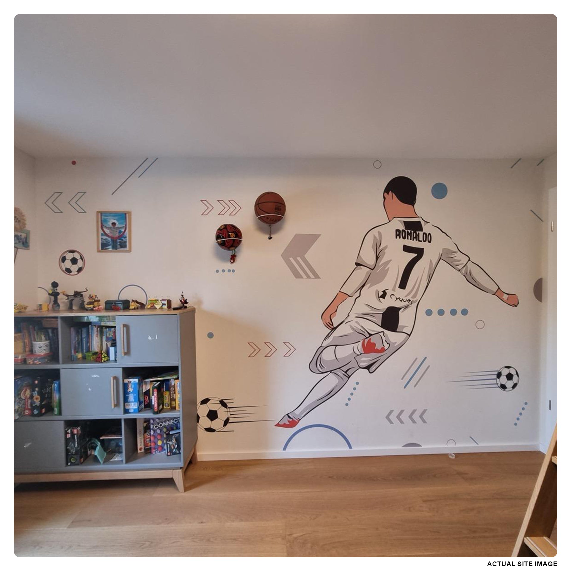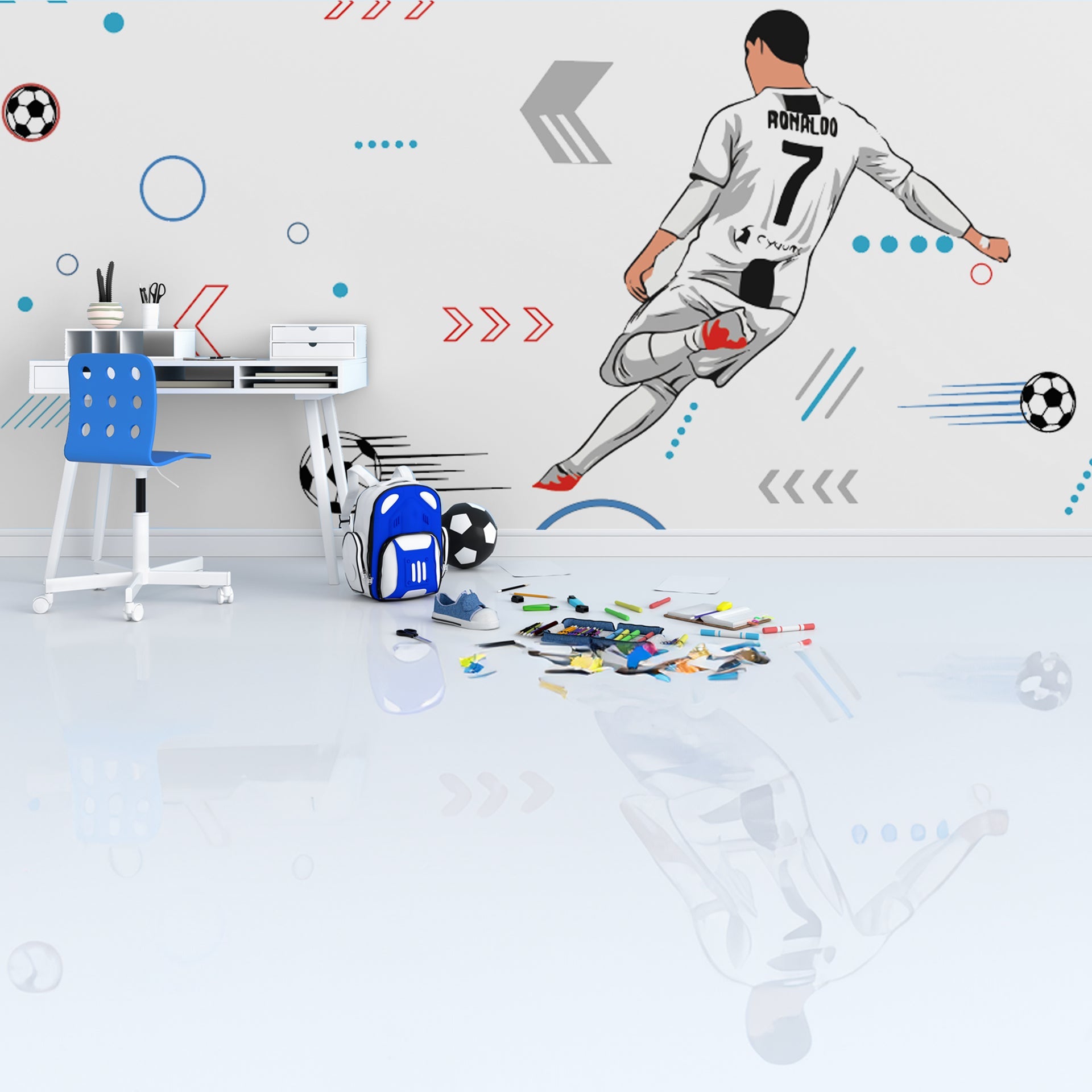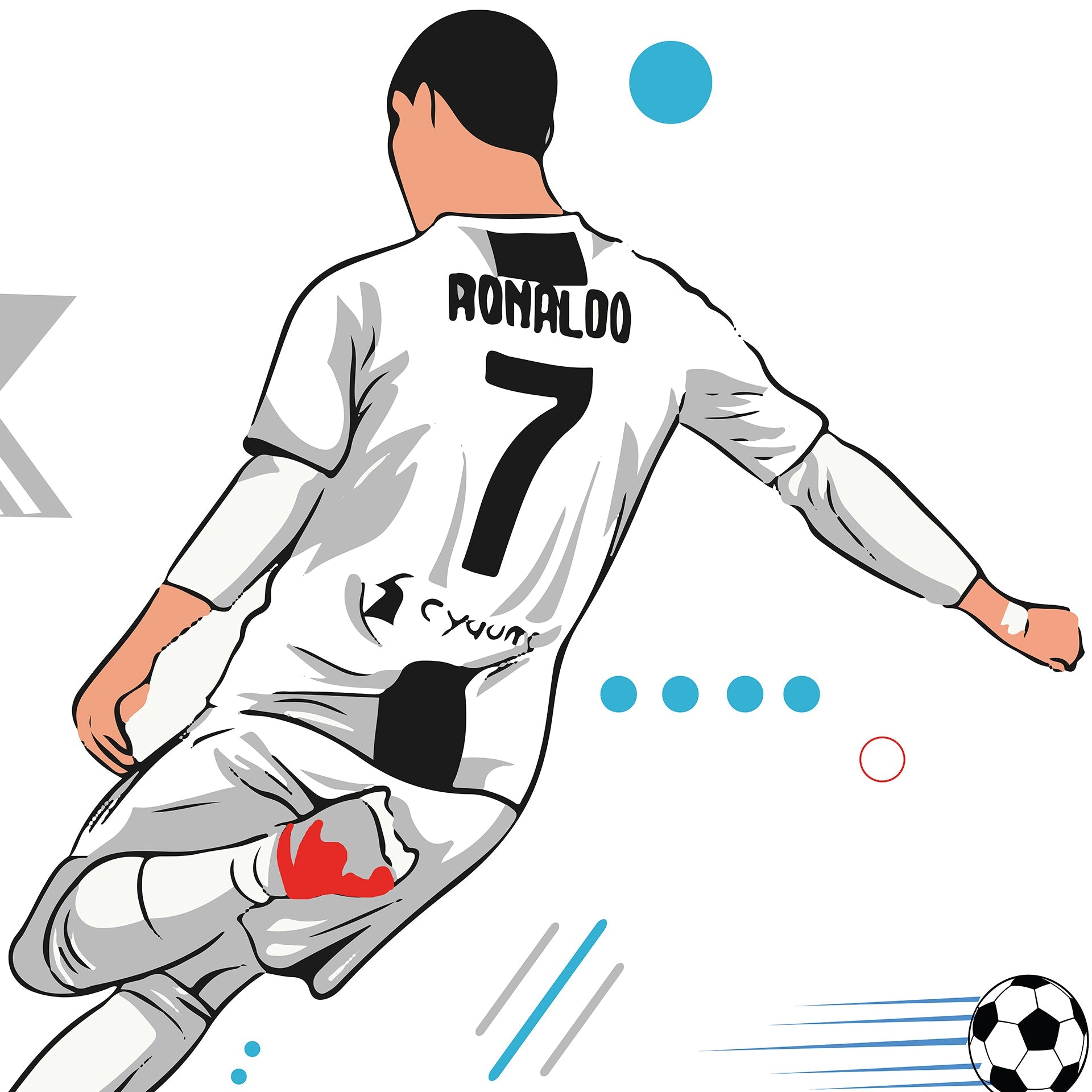 Illustrative artwork of a soccer player about to kick a ball, set against a backdrop of colorful geometric patterns, showcasing movement and energy in sports.