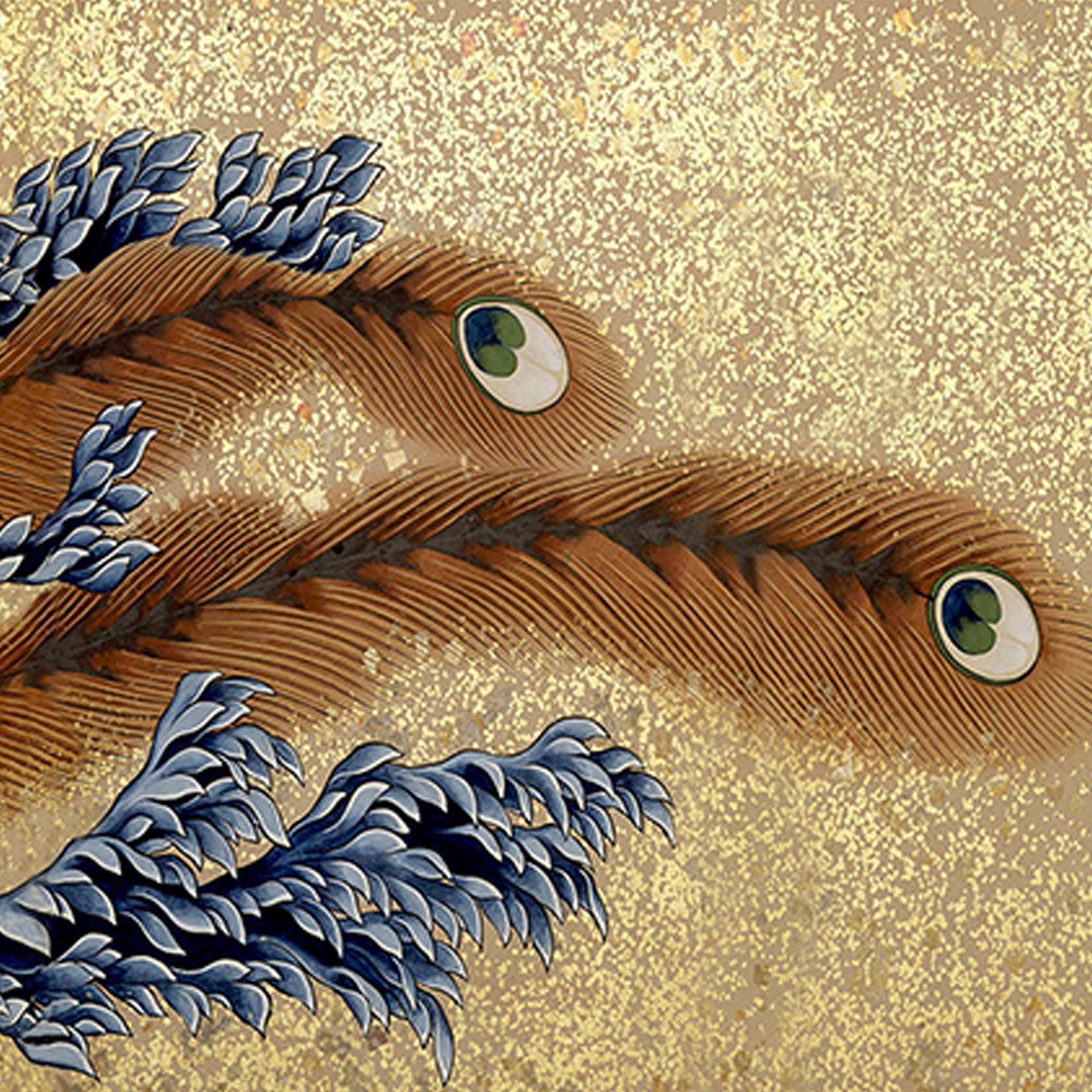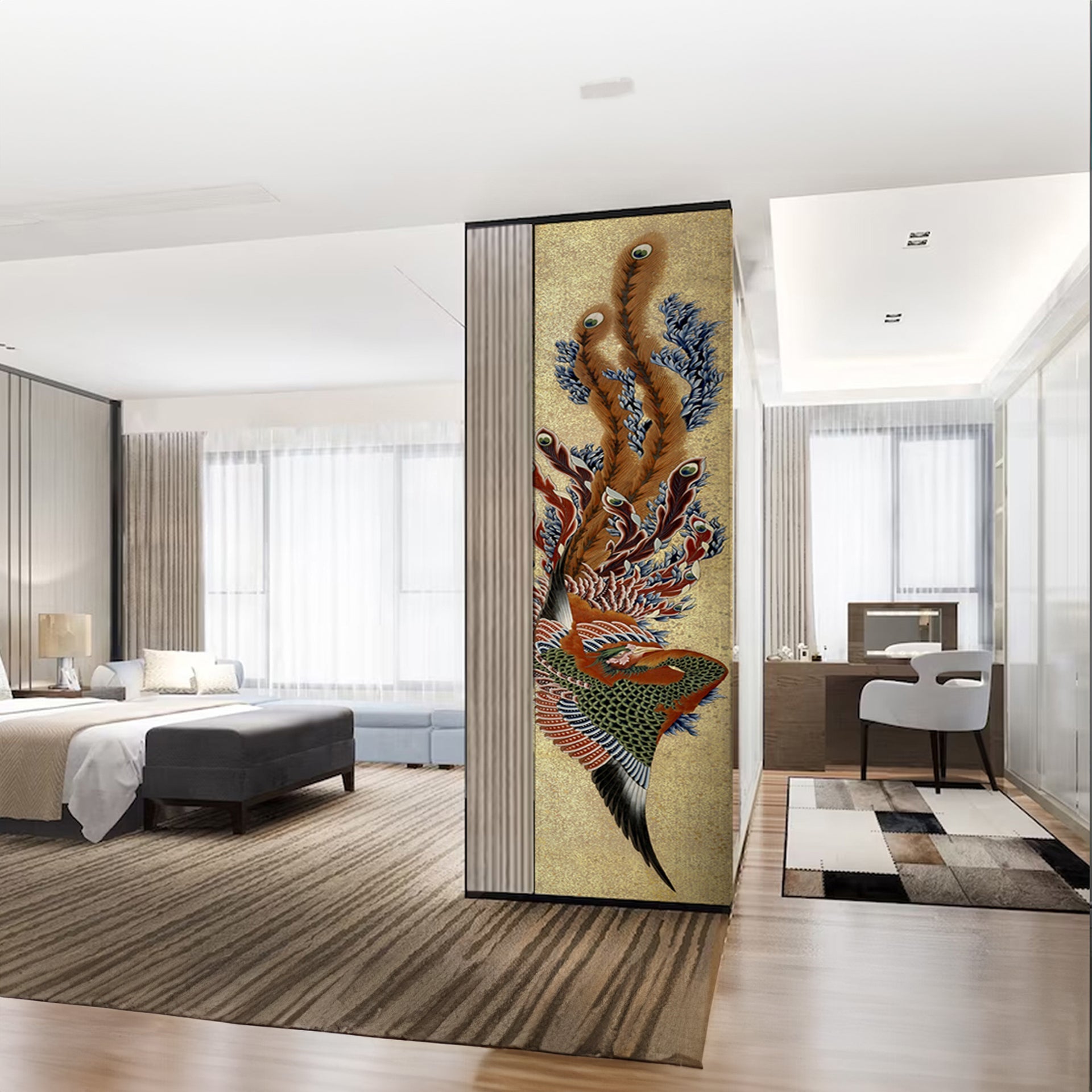 Royal Phoenix Feather" wallpaper design showcases intricate phoenix feathers in rich, vibrant hues, adding a touch of regal sophistication. This wall art is perfect for living room, art gallery, luxury malls, luxury showrooms.