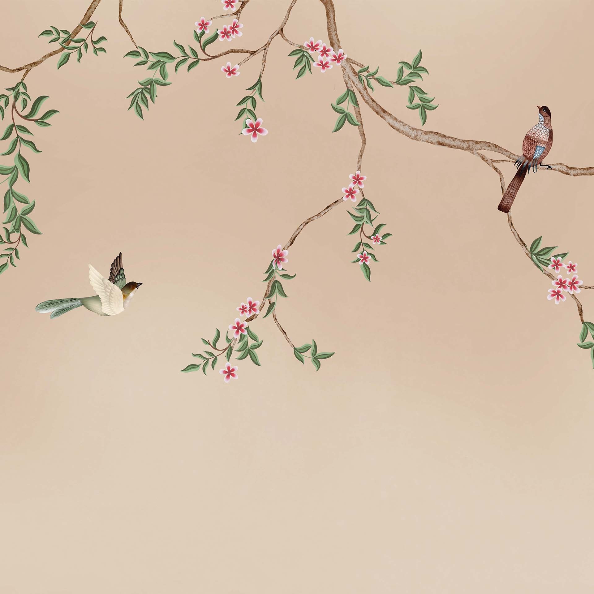 Springtime Blossoms: Hand-Painted Cherry Blossom Branches With Birds on Beige Mural-Sample