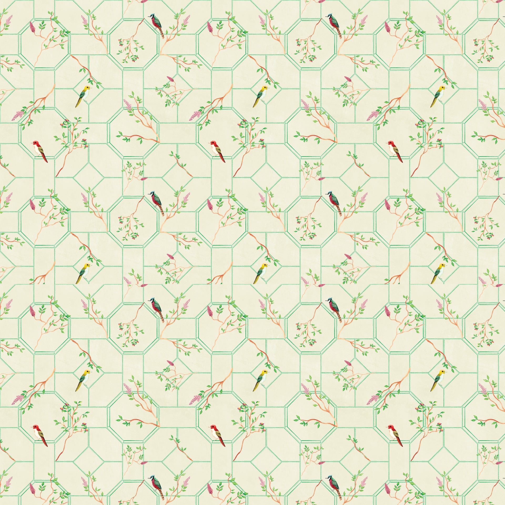 A seamless geometric pattern featuring hexagon outlines and delicate botanical branches with colorful small birds, set on a soft beige background. Ideal for wallpaper, textiles, and decor projects seeking nature-inspired charm.
