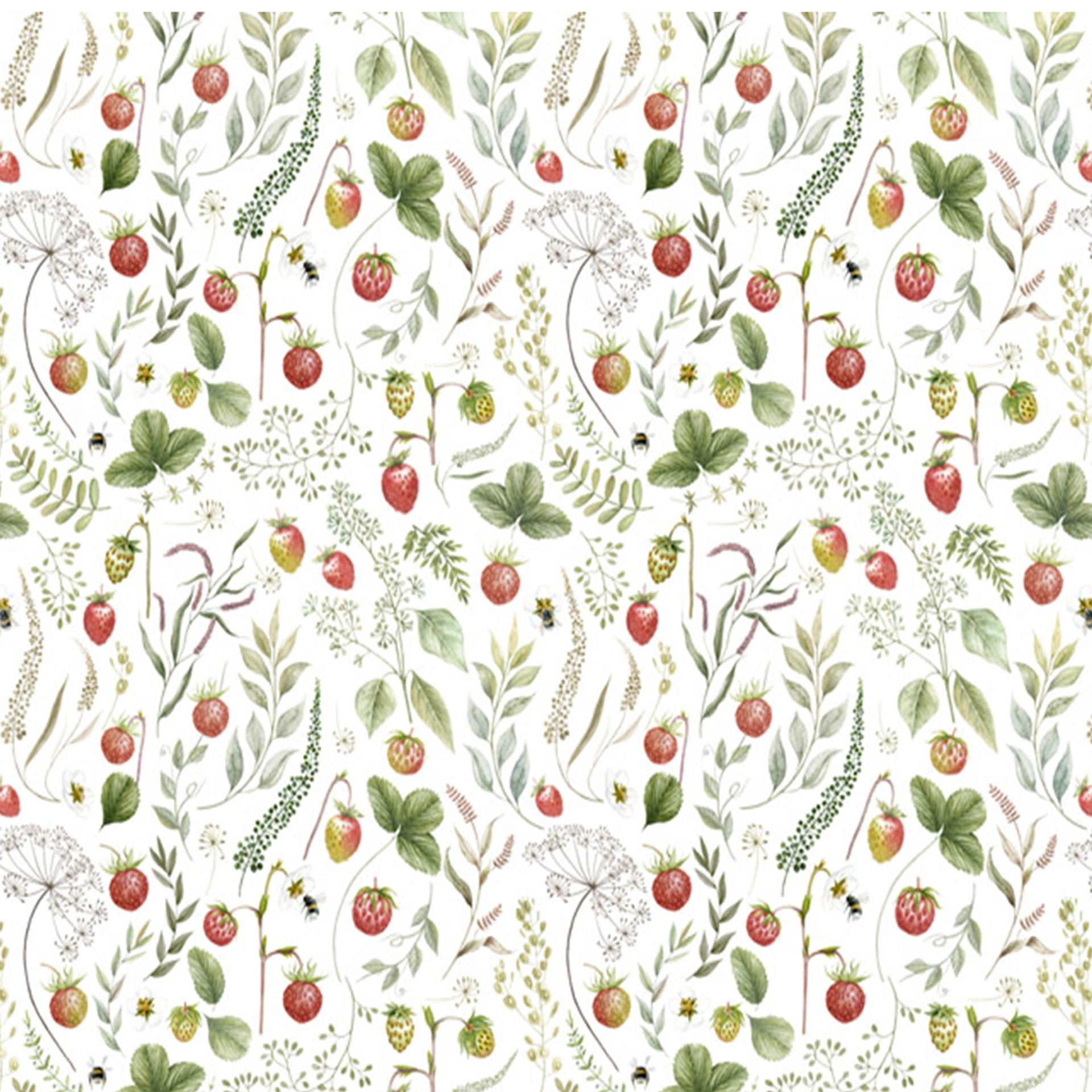 Vibrant botanical repeating pattern featuring delicate leaves, tiny blossoms, and ripened red berries. Ideal for fabric, wallpaper, stationery, or home decor, evoking fresh garden-inspired style and natural calm.
