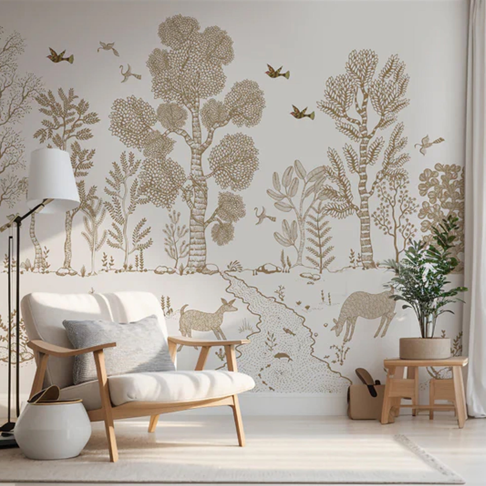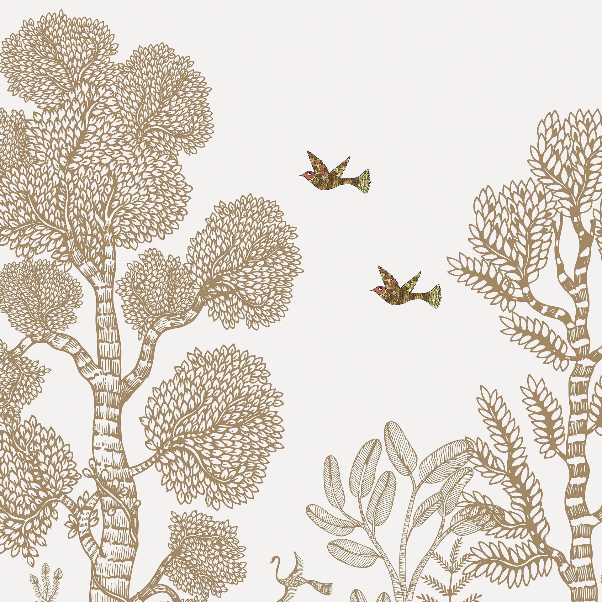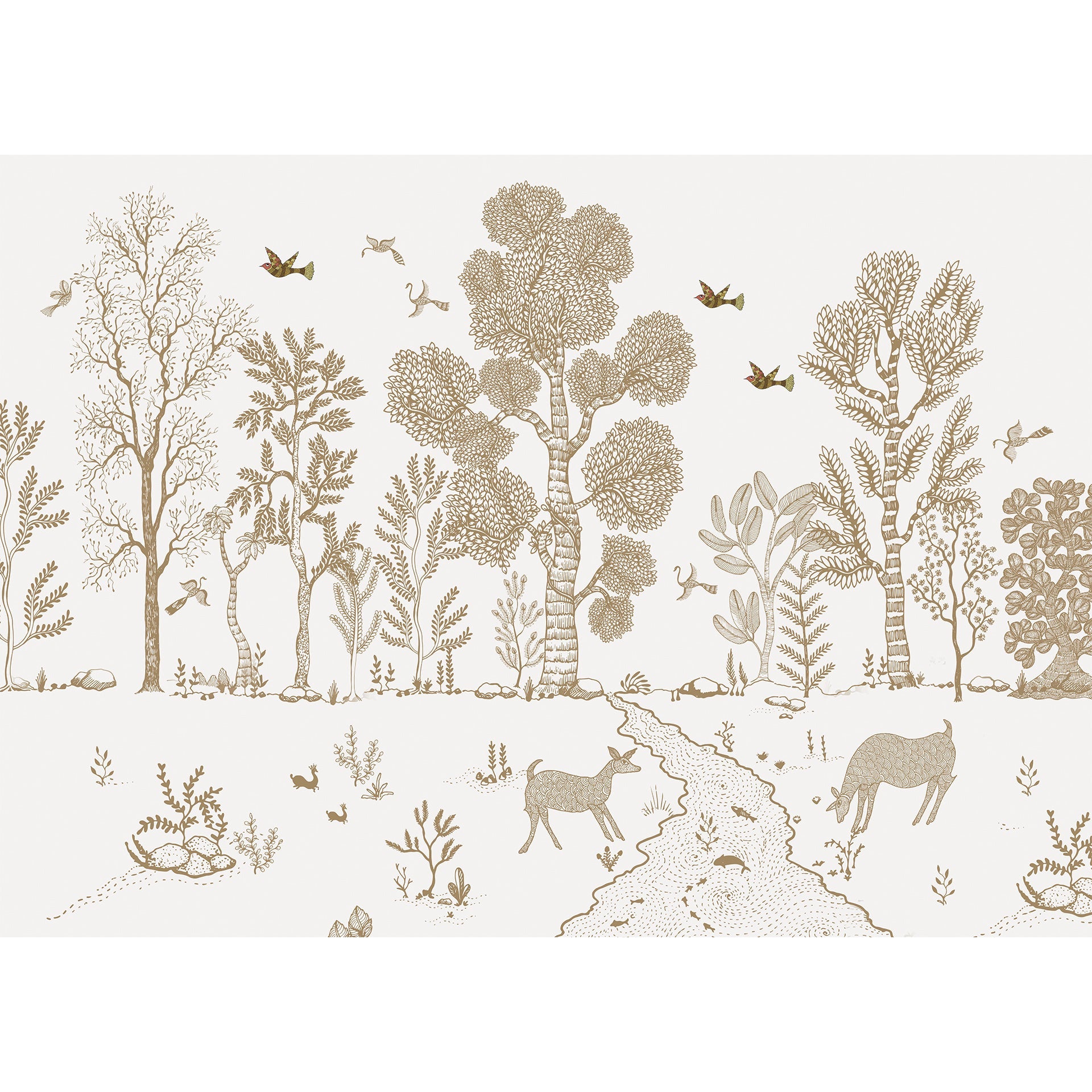 Illustrated nature scene with delicate line-drawn trees, birds in flight, woodland animals, and plants. Soft tones and detailed craftsmanship create a serene and harmonious illustrative charm.