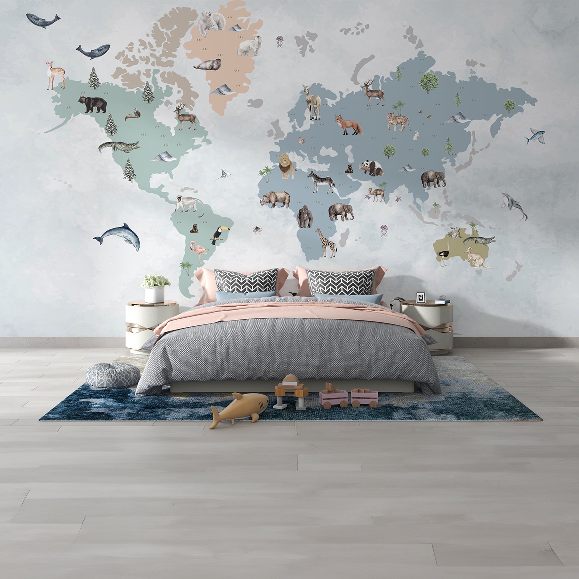 World map wallpaper for nursery with water, land and snow animals. Transform your kid's room with educational gerophrahy wallpaper.